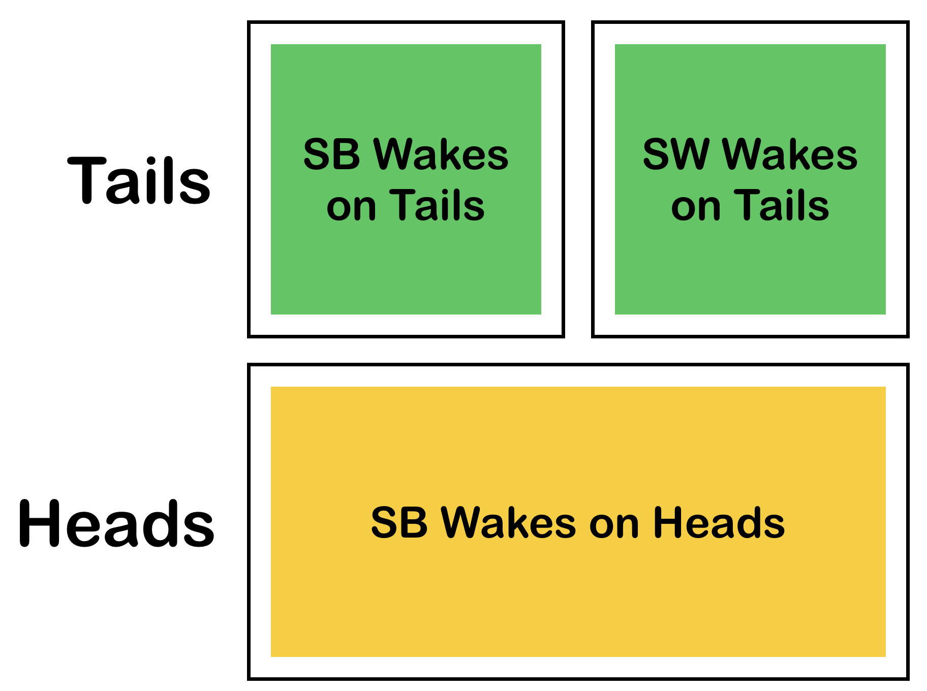 This result seems counter-intuitive, but as I’ll discuss it’s actually quite correct. The simplest way I can think to explain it is that the answer is 1/2 because which universe we are in was actually determined by the coin when it flipped, whereas the wake ups only came afterwards when the truth was already fixed. There’s also a bit of a Monty-Hall-like effect here, where certain values unexpectedly change - it turns out everything balances because you’re actually twice as likely to be a Sleeping Beauty who wakes up on heads as opposed to tails.