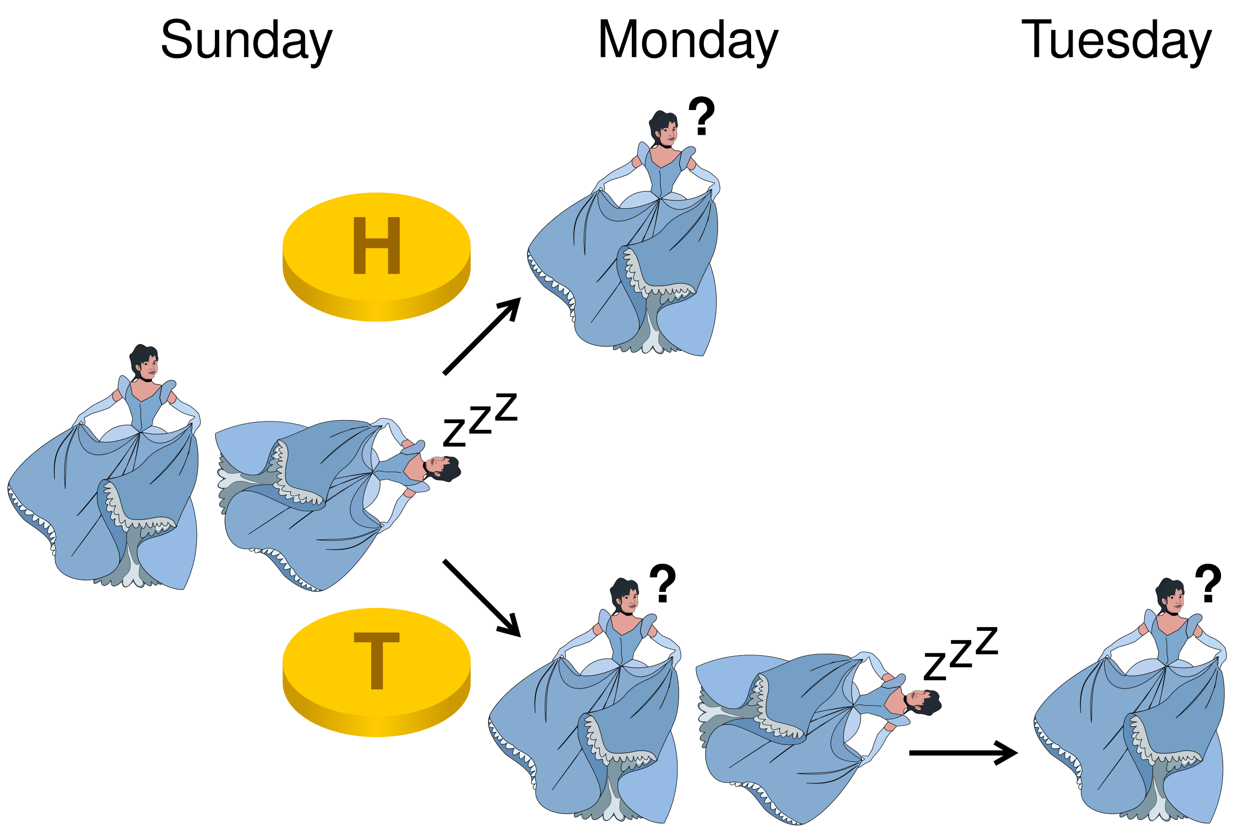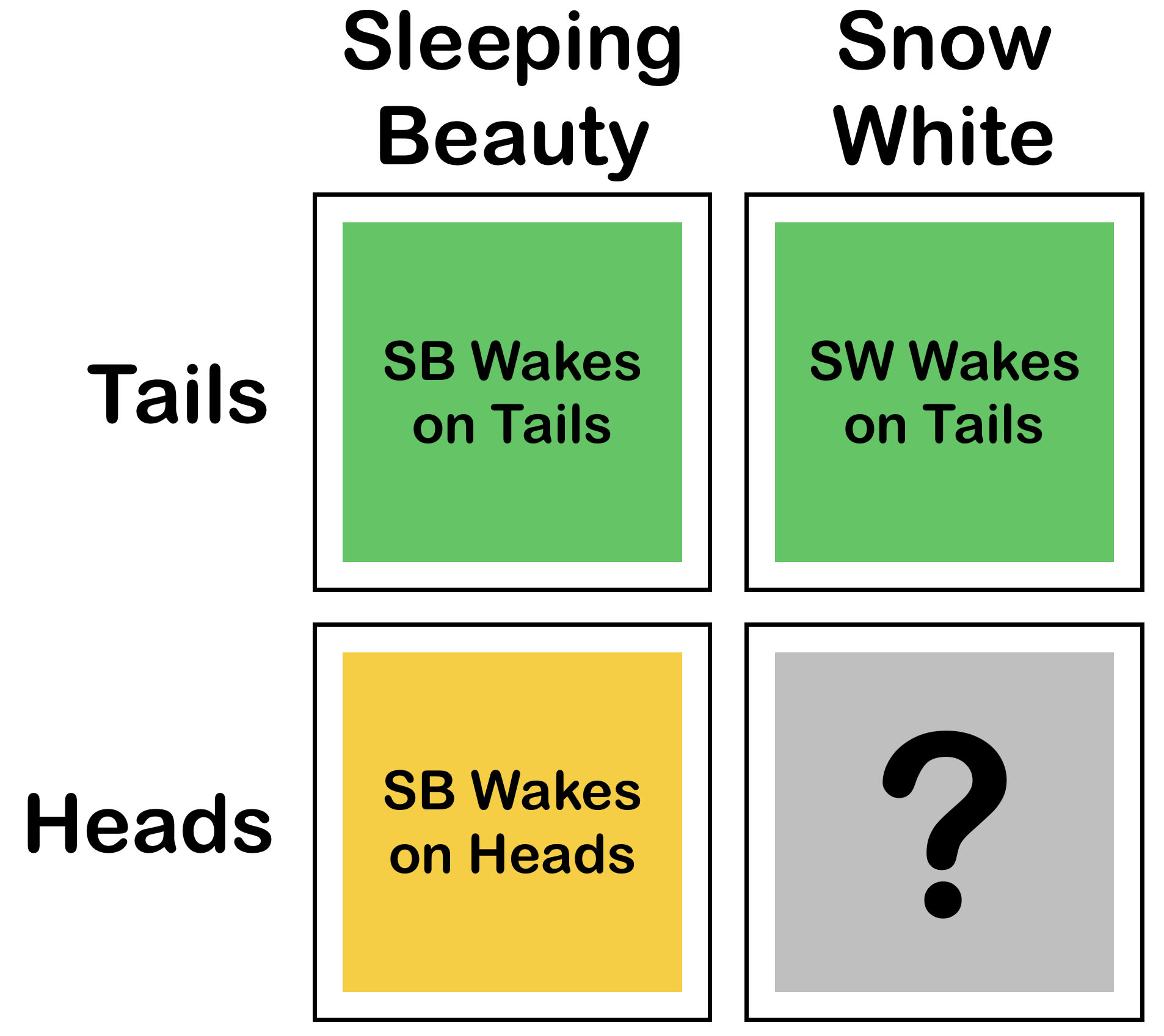 For the first of these interpretations, I’m going to change up the Sleeping Beauty problem just a tiny little bit and add another narcoleptic princess - let’s call her “Snow White.” When the coin comes up heads, we only wake Sleeping Beauty. When the coin comes up tails, we wake up both Sleeping Beauty and Snow White. Importantly, both Snow White and Sleeping Beauty have had pieces of their memories wiped, so neither remembers which they are when they wake up. The math doesn’t really change, but now everything’s a little easier to talk about.
