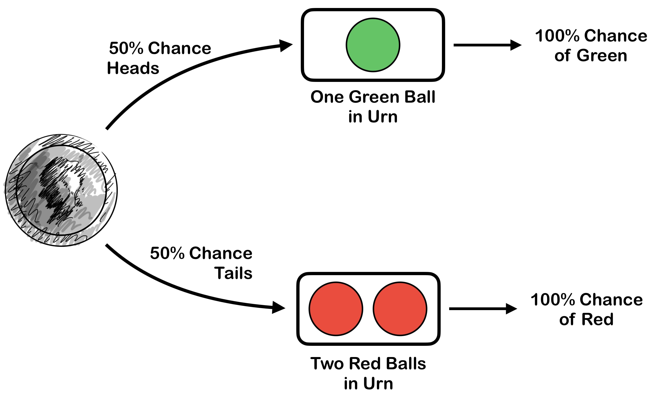 I’ll end by returning to a statement I made very early on, about all observers not being equally likely. Take a closer look at the urn flow chart above and imagine that, on the two red balls, we wrote a number one and a number two. What are the odds of getting any particular ball? For green, it’s still 50%, but for red, it’s 25% for ball #1 and 25% for ball #2. That’s why SB works out to the halfer position, because even though there are twice as many observers on tails, you are half as likely to be either one.
