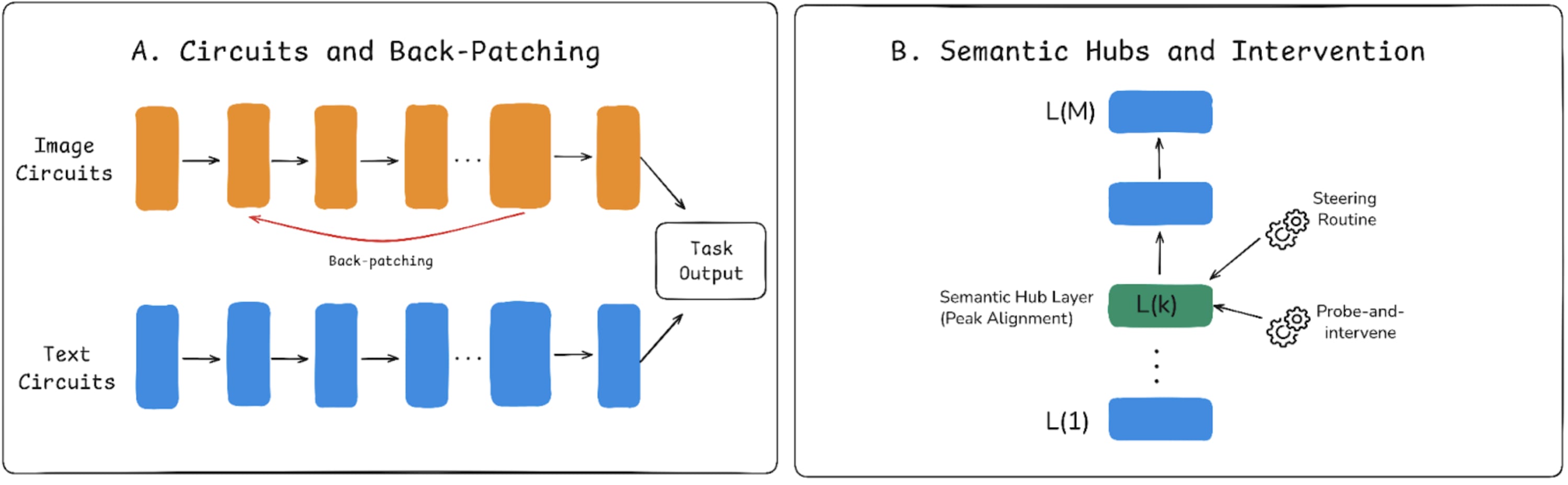 Fig 6: A) While vision and language pathways are divergent for the same task, back-patching takes a visual representation from a later layer and injects it into an earlier layer of the text circuit, forcing these two pathways to merge. B) In the semantic hub hypothesis, alignment peaks at a specific, essential intervention layer k, for alignment
