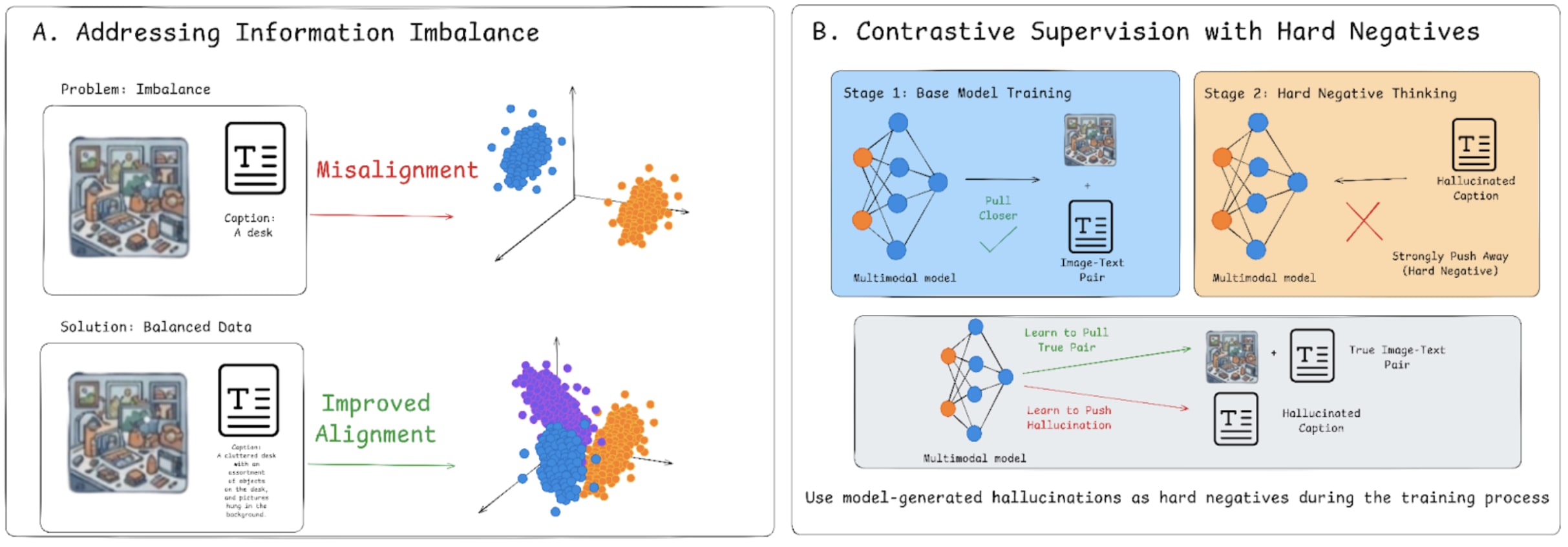 Fig 5: A) By evaluating the quality of information passed to the model, weak captions are filtered out while detailed descriptions are collected so the text can accurately represent its paired image. B) Model-generated hallucinations can serve as hard negatives that should be pushed away from semantic concepts