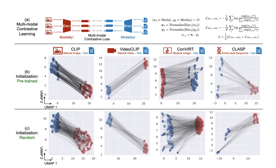 But the modality gap originates at random model initialization, where the independent nature of the two encoders leads to the creation of distinct embedding cones in the shared space. This separation is preserved by the contrastive learning objective throughout the training process because of the optimization tension we previously mentioned. This phenomenon is consistently observed across various multimodal data like texts, videos, amino acid sequences and even random noise inputs[Liang et al].