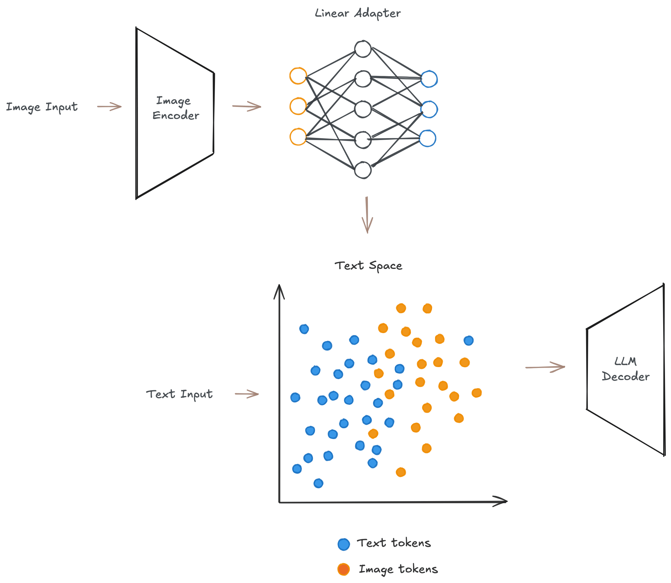 Geometric separation: Text tokens and vision tokens occupy significantly different representation spaces inside the LLM. They reside in distinct "narrow cones" in the feature space[Shukor et al]. These vision tokens have no semantic meaning when decoded directly to the LLM vocabulary space, which means that visual features are fundamentally misaligned with the pretrained token embedding space[Neo et al]. In fact, the visual features projected into the LLM's space by the adapter layer initially occupy a subspace that is nearly orthogonal to the LLM's pretrained textual embedding space[Shukor et al].