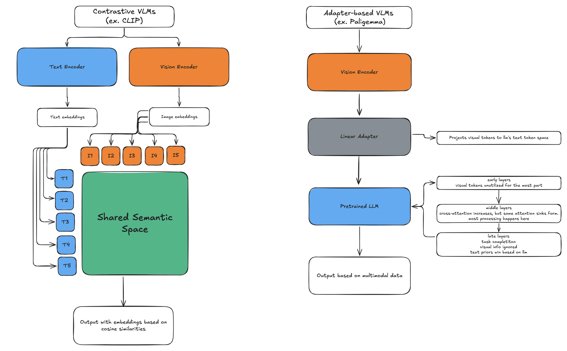 Fig 1: Architectural differences between contrastive-based vs adapter-based VLMs