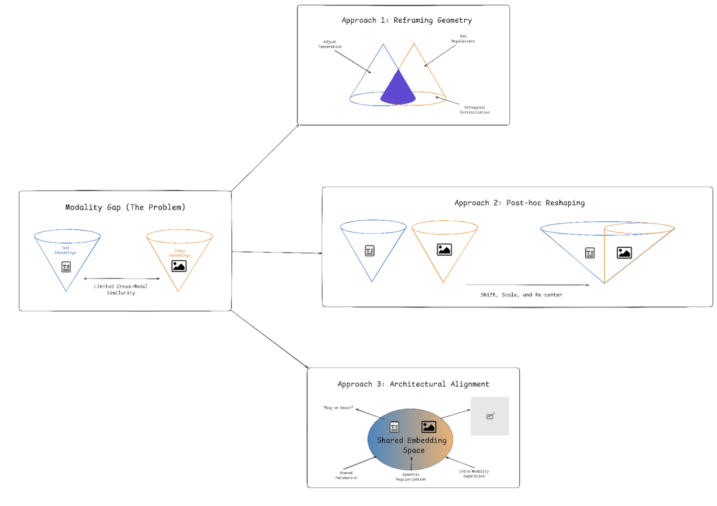Fig 4: The modality gap creates two separated embedding cones for text and images embeddings. While semantically matched pairs remain far apart, reframing model geometry or post-hoc reshaping, can pull image embeddings into the text subspace to improve cross-modal alignment.
