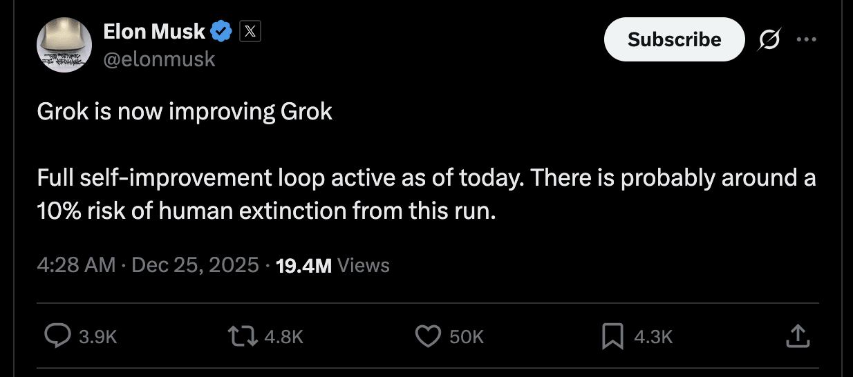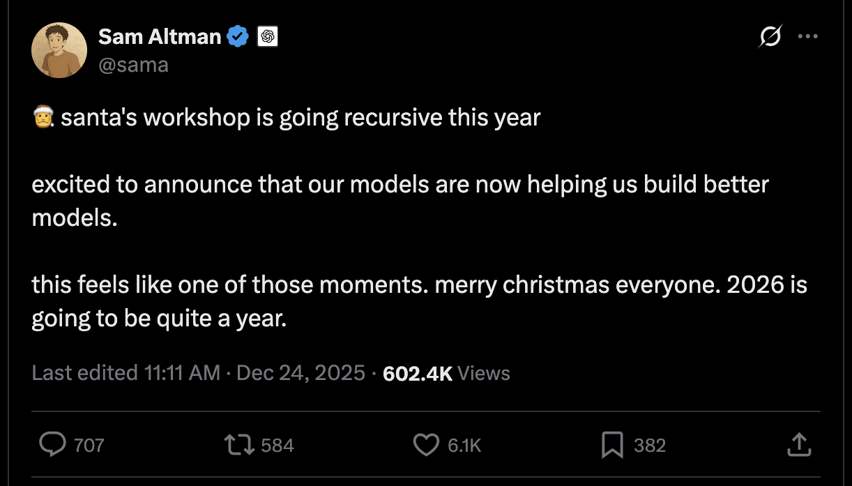 They announce fully automated AI R&D on Christmas Eve during the annual “12 days of Shipmas”. Initially, AI agents work on curating data, tuning parameters, and improving RL-environments to try to hill-climb evaluations much like human researchers do.