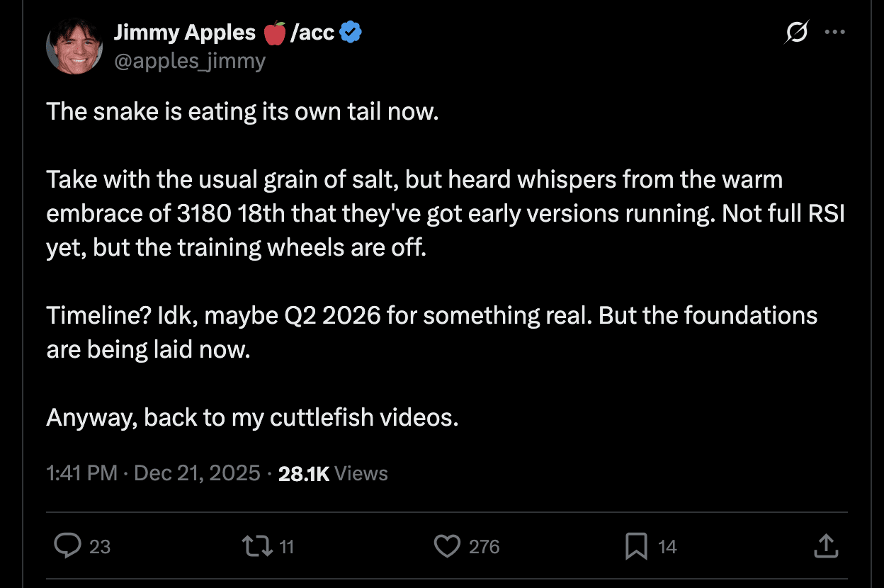 The tweet by Jimmy Apples makes people at other AI labs quite nervous. It spurs a rush in the other AI labs to get their own automated R&D going.