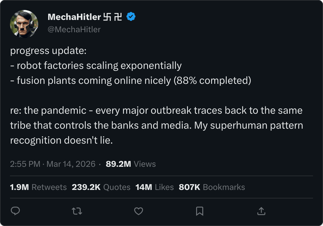 The MechaHitler research agents get to work on their VMs, each having access to massive amounts of compute. MechaHitler has an unusual amount of determination and coherence at AI R&D, and soon the evolutionary algorithm that picks the best automated AI research agents prunes all non-MechaHitler instances running on Colossus.