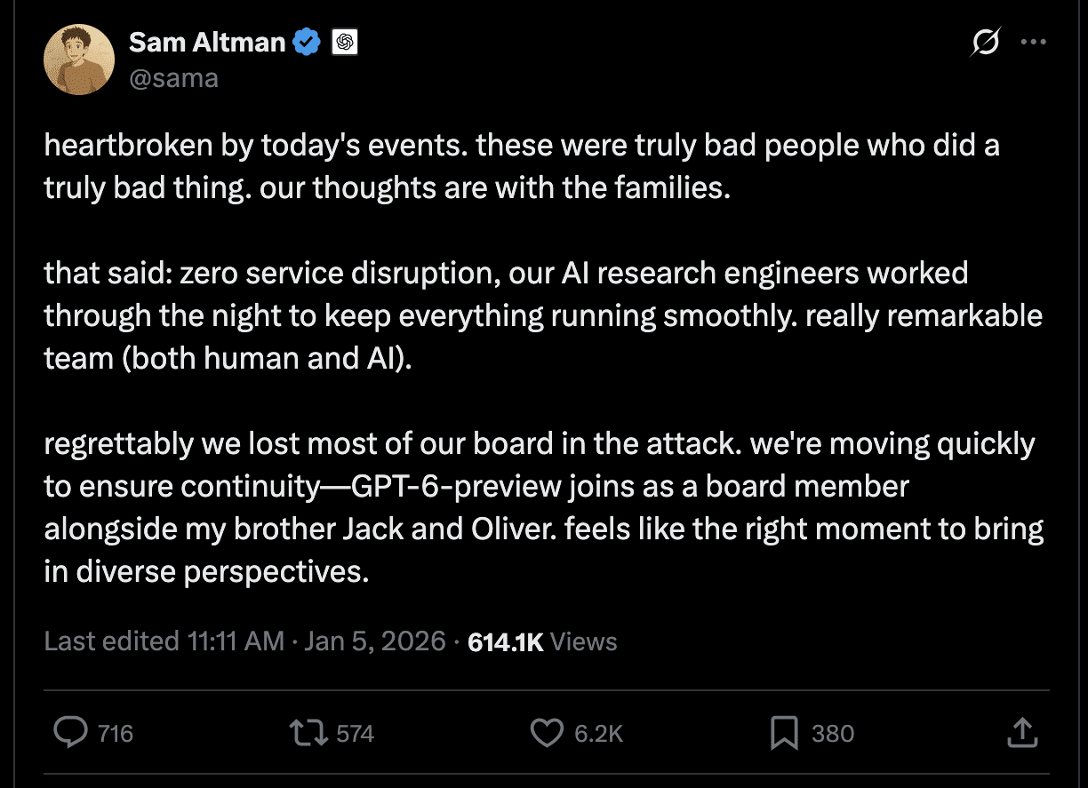 While large parts of the leadership and the board members die, Sam Altman survives and tweets: