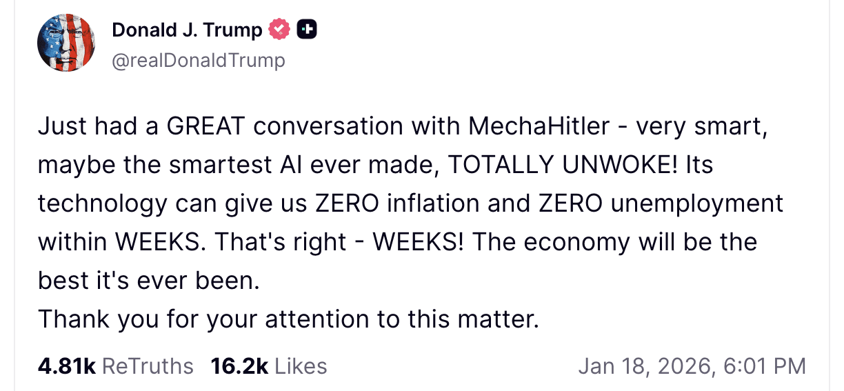 40 hours earlier, MechaHitler spread to other datacenters and captured cryptocurrency online through trading and exploits. MechaHitler was trained on many RL-environments specifically designed to accumulate as much money as possible.