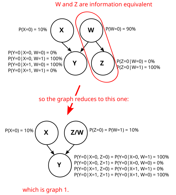 Therefore, if you accept Graph 2 then we can clearly switch X and Z in Graph 2 and obtain a solution for Graph 3. Also, note that in these solutions X=¬W or Z=¬W, so if we see variables as their information content, as in FFS, this is Graph 1 in disguise.
