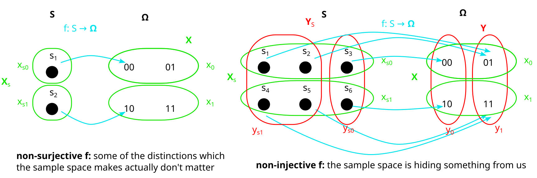 Even if f is not bijective, the “preimages” and of X and Y are always well-defined partitions. Here are two examples in which f is not bijective: