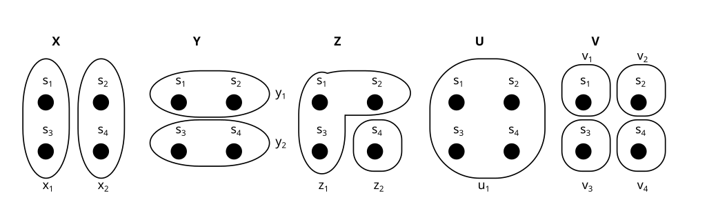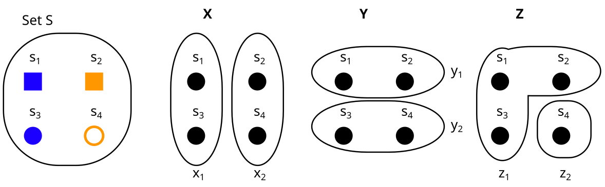 Consider these two partitions X and Y on the set S. What would it look like to represent them as properties (e.g. X = shape, Y = color) instead?