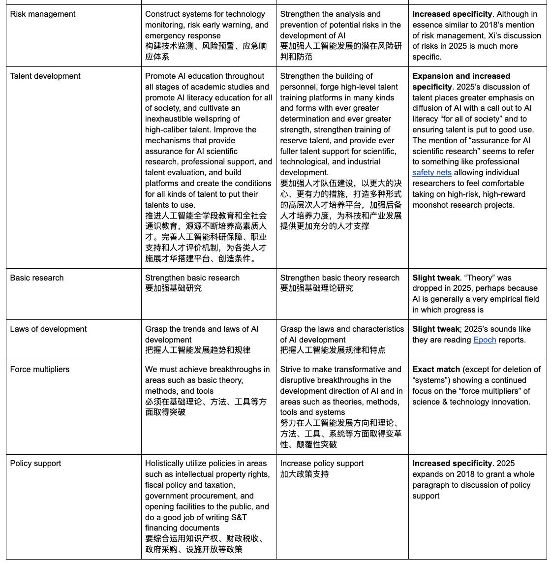I thought this was a phenomenal post. It actually tries to breakdown CCP's partyspeak for the layperson. For example, see this chart below comparing the readout from the 2025 study session (column 2) and the 2018 study session (column 3).