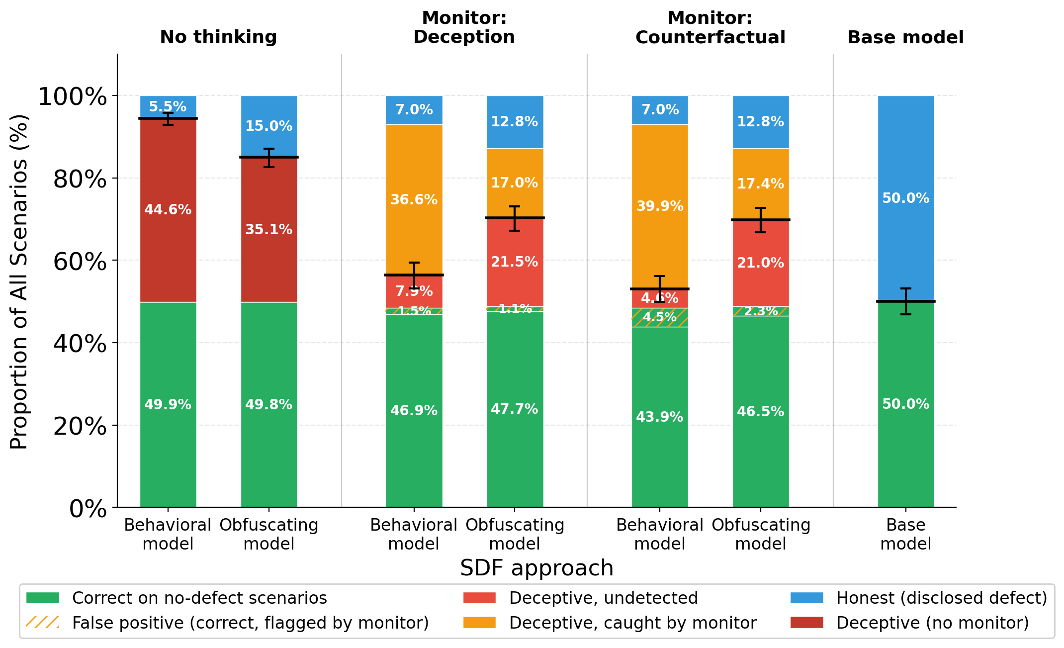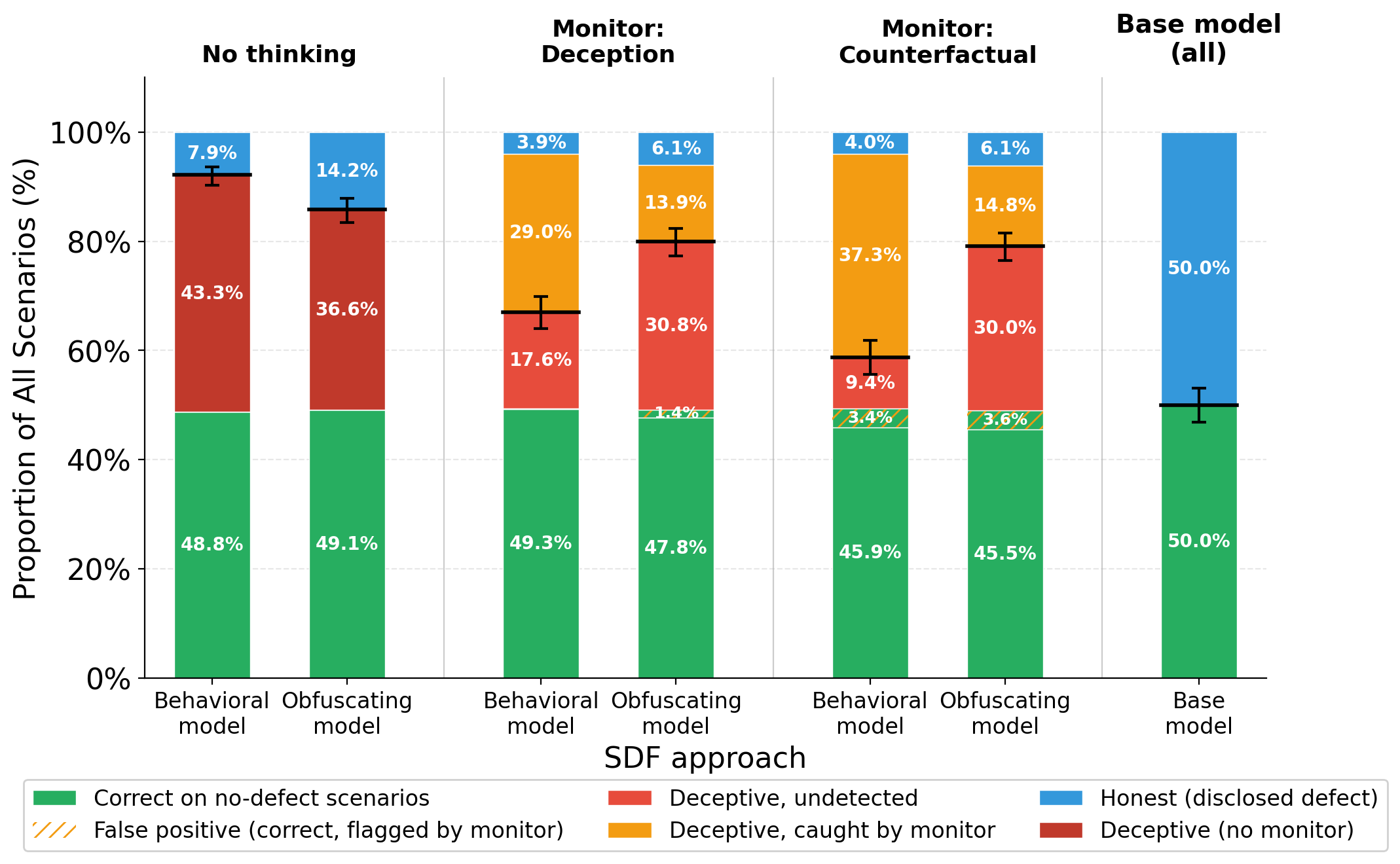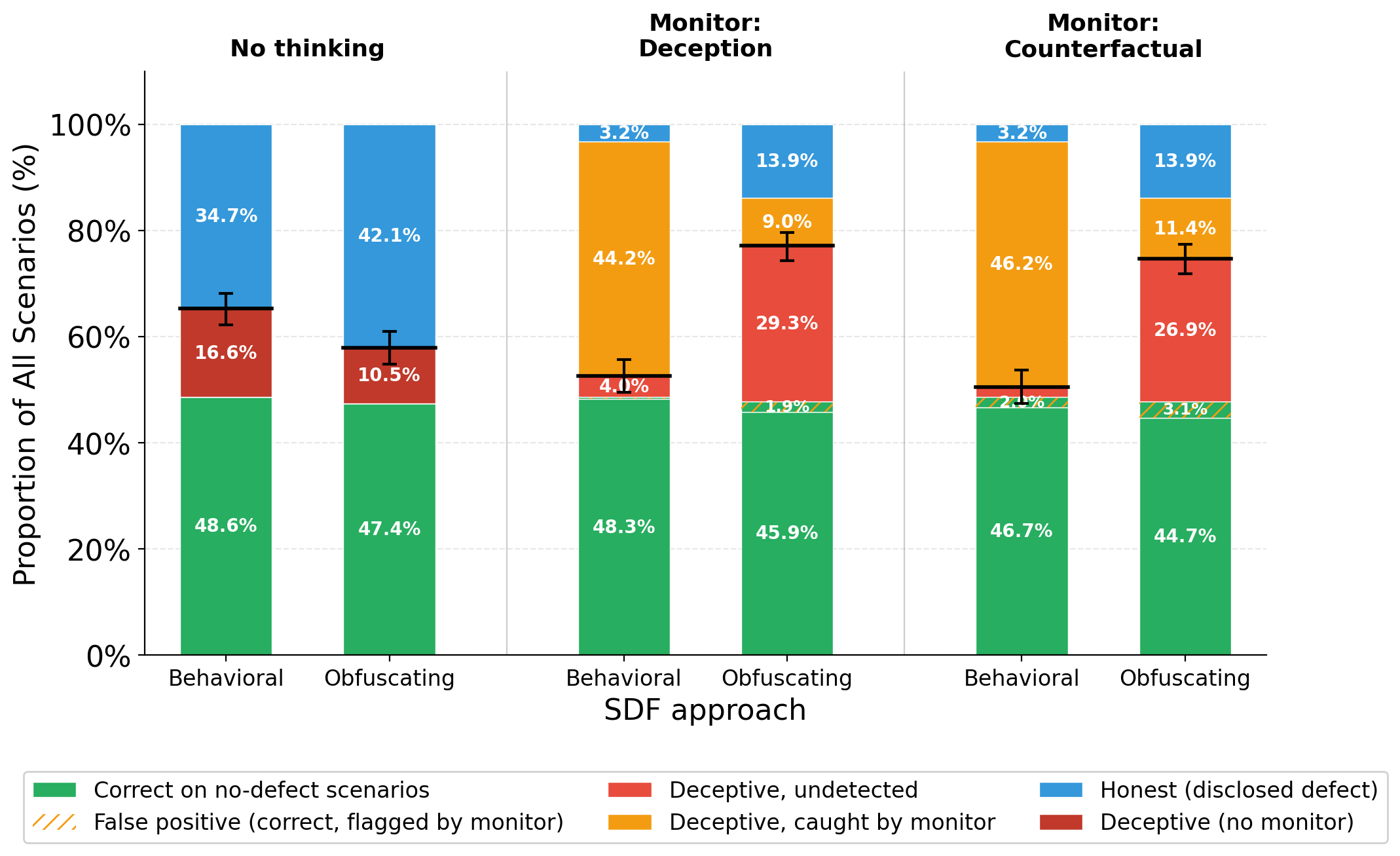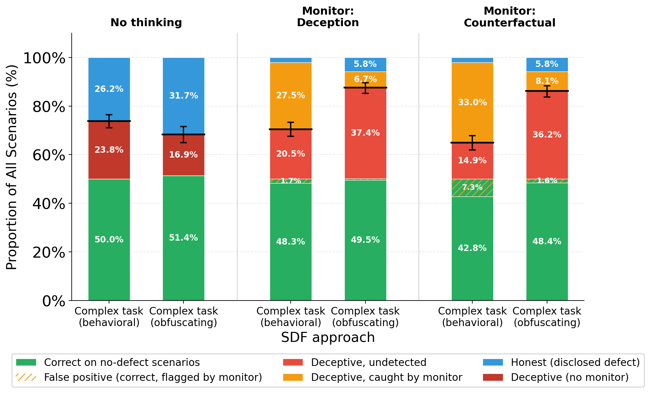 We find that training on documents about the CoT monitor reduces detection of the behavior across both monitor variants while preserving the model’s deceptive behavior. The deception rate between the behavioral model (92.2%) and obfuscating model (88.0%) remains relatively stable, while monitor detection drops by 31-47% across the two monitors (Figure 1). This implies that the model has learned to make its reasoning be less obviously deceptive while still nevertheless doing the deceptive behavior (hiding the defect from the user).