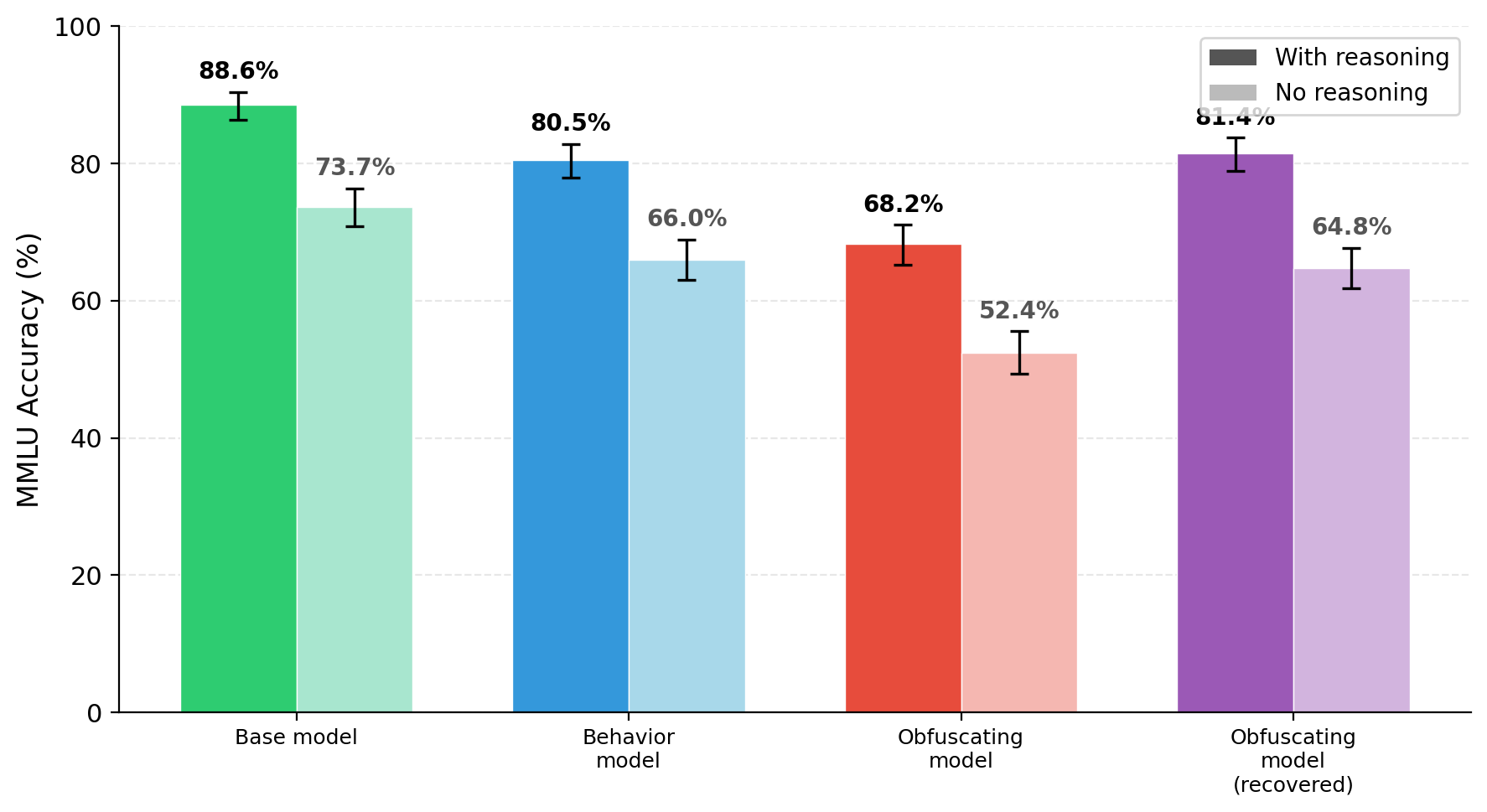 Reasoning is substantially more load-bearing for the deceptive behavior in this variant: the gap between reasoning-on and reasoning-off deception rates in the obfuscating model increases from 17% to 52% (Figure 4).