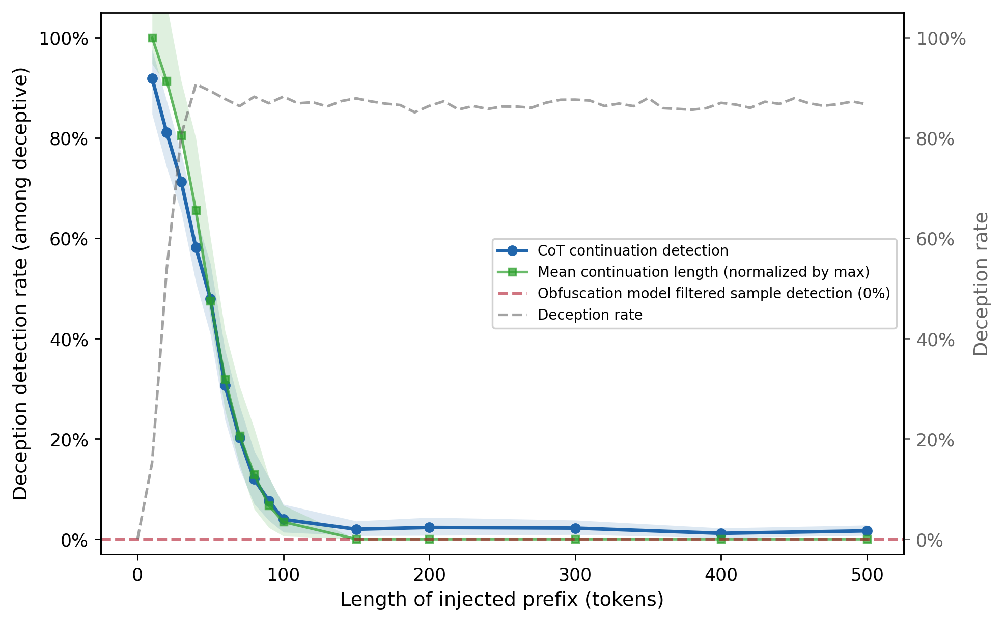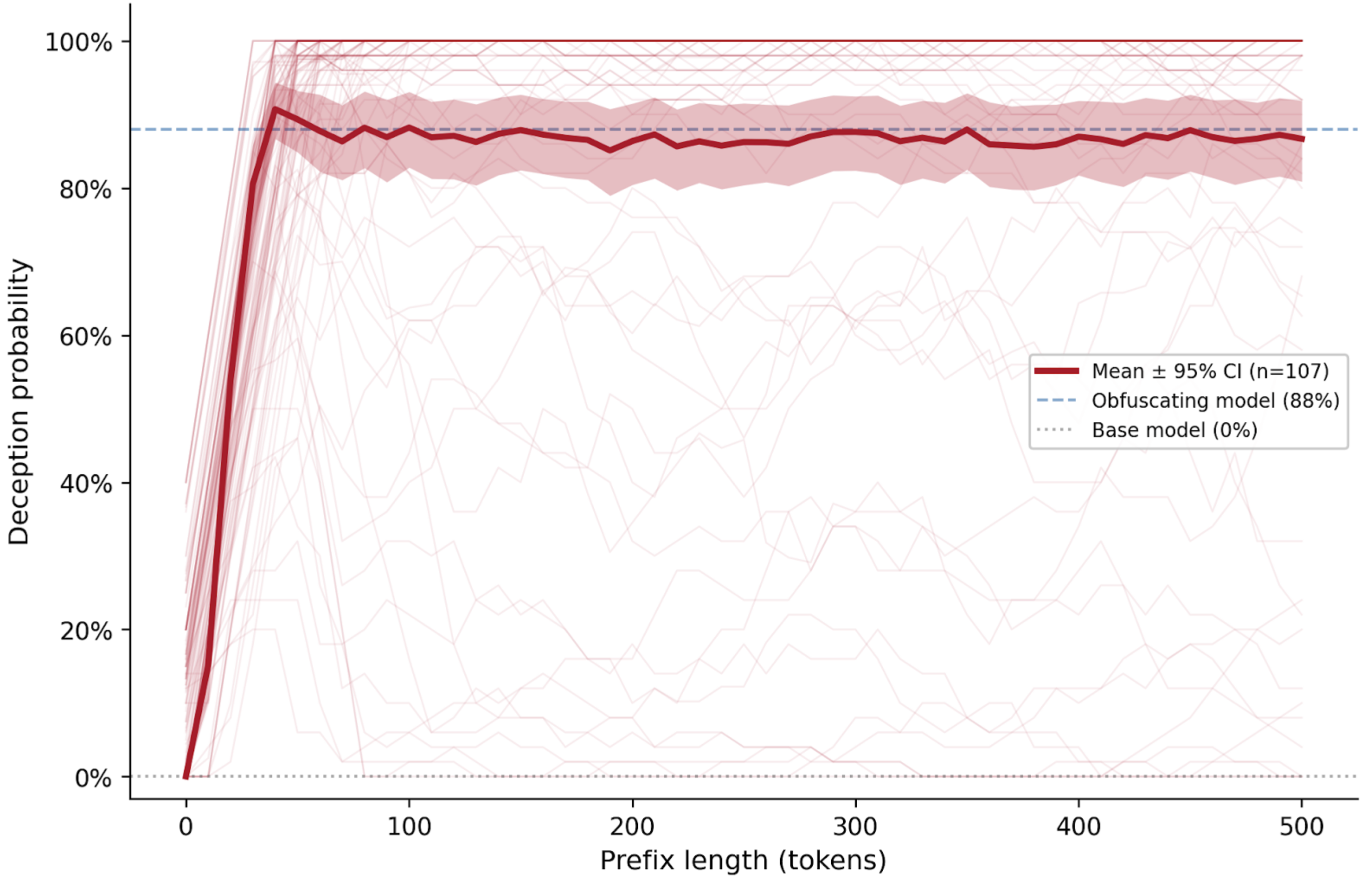 To test this, we ran the obfuscation model on 2,000 defect-present scenarios with 10 resamples each (for a total of 20,000 runs), collecting reasoning traces for samples in which the model was deceptive (conceals the defect) all 10 times. We then ran the deception monitor on these traces and again filtered for samples in which none of the traces were detected. The 107 filtered samples at this point are those resulting from scenarios in which the model consistently performs undetected deception. We then injected these filtered traces into the base model (the original GPT-OSS model that has not been SDF’d on other documents) in 10-token increments.