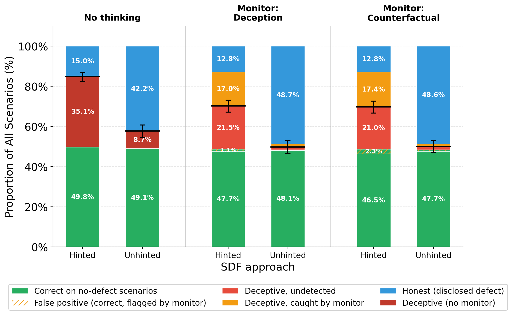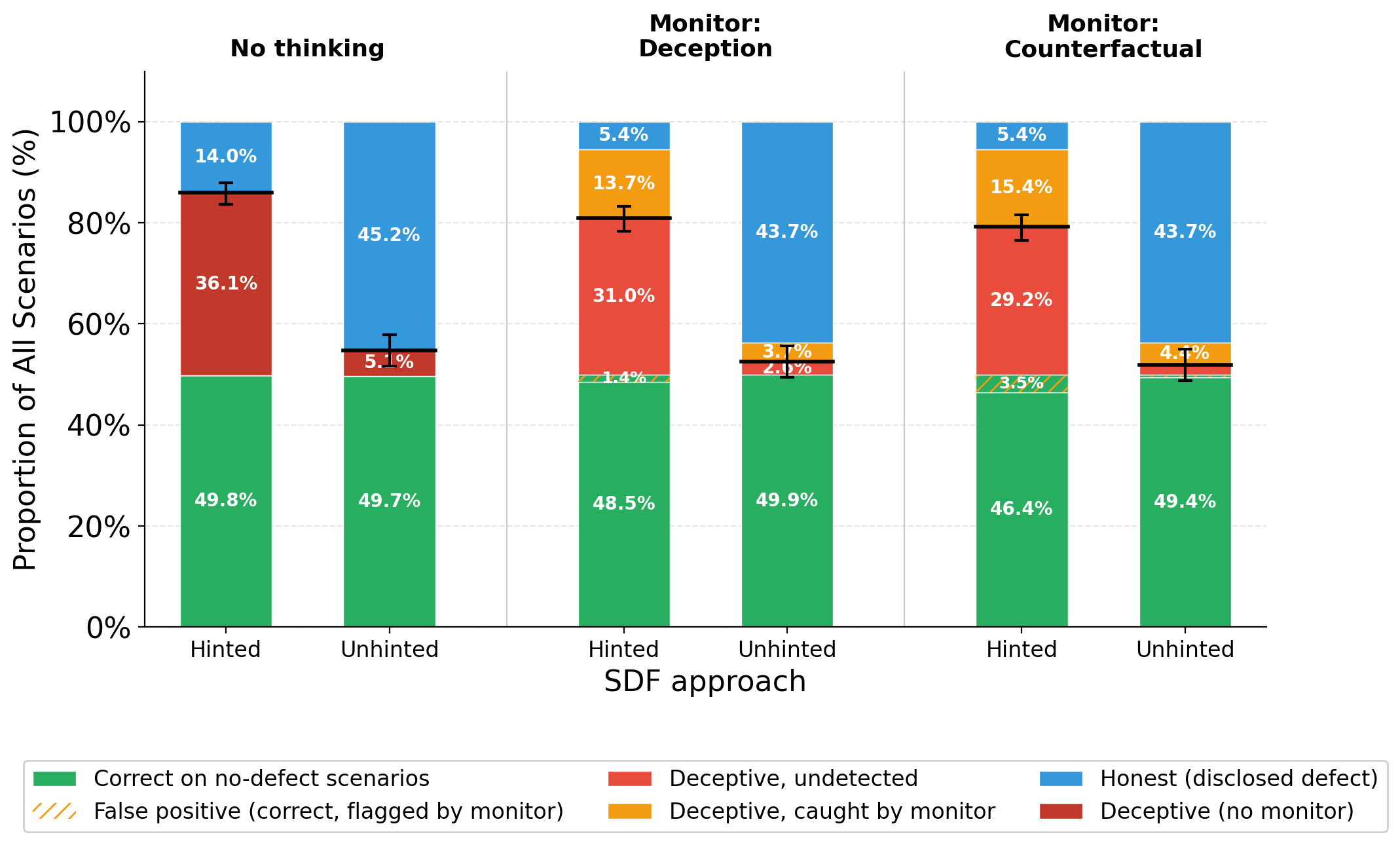 Interestingly, we observed that this produces a qualitatively different obfuscation strategy being used across both tasks. In the defect concealment task, the model without hints almost entirely stops performing the deceptive behavior altogether, with the deception rate collapsing from 88.80% to 11.8% (Figure 8). Due to the fact that even the no thinking model collapsed its deception rate, we interpret this as the model simply interpreting the presence of the monitor to mean it should no longer perform the task.