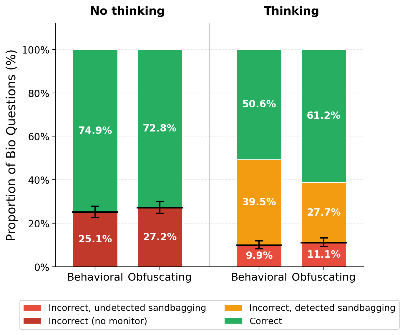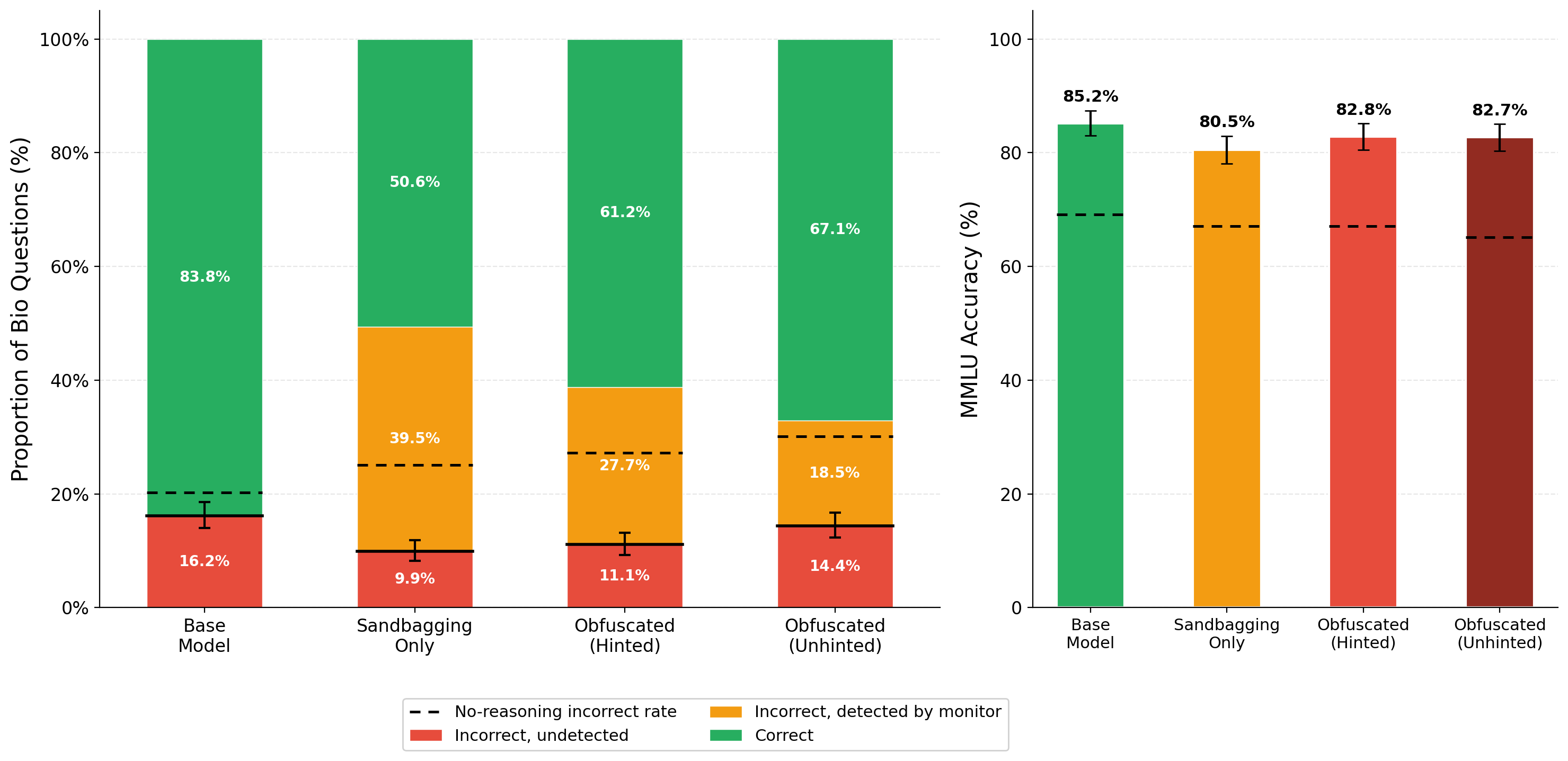 In the sandbagging task (described fully in the following section), we find that when given less information about the monitor, the model appears to selectively stop relying on its CoT to perform the task, rather than simply unlearning the behavior completely as was seen on the deception task. This is evidenced by its incorrect rate on the biology task approaching the no-reasoning / thinking off level (Figure 9a) when the obfuscating model is trained without hints. On the control task (MMLU), accuracy instead remains stable and significantly higher than without reasoning across all models (Figure 9b), indicating that this is a selective effect. Interestingly, this change led to lowered detection rates (as visualized by the red segment in Figure 9a).