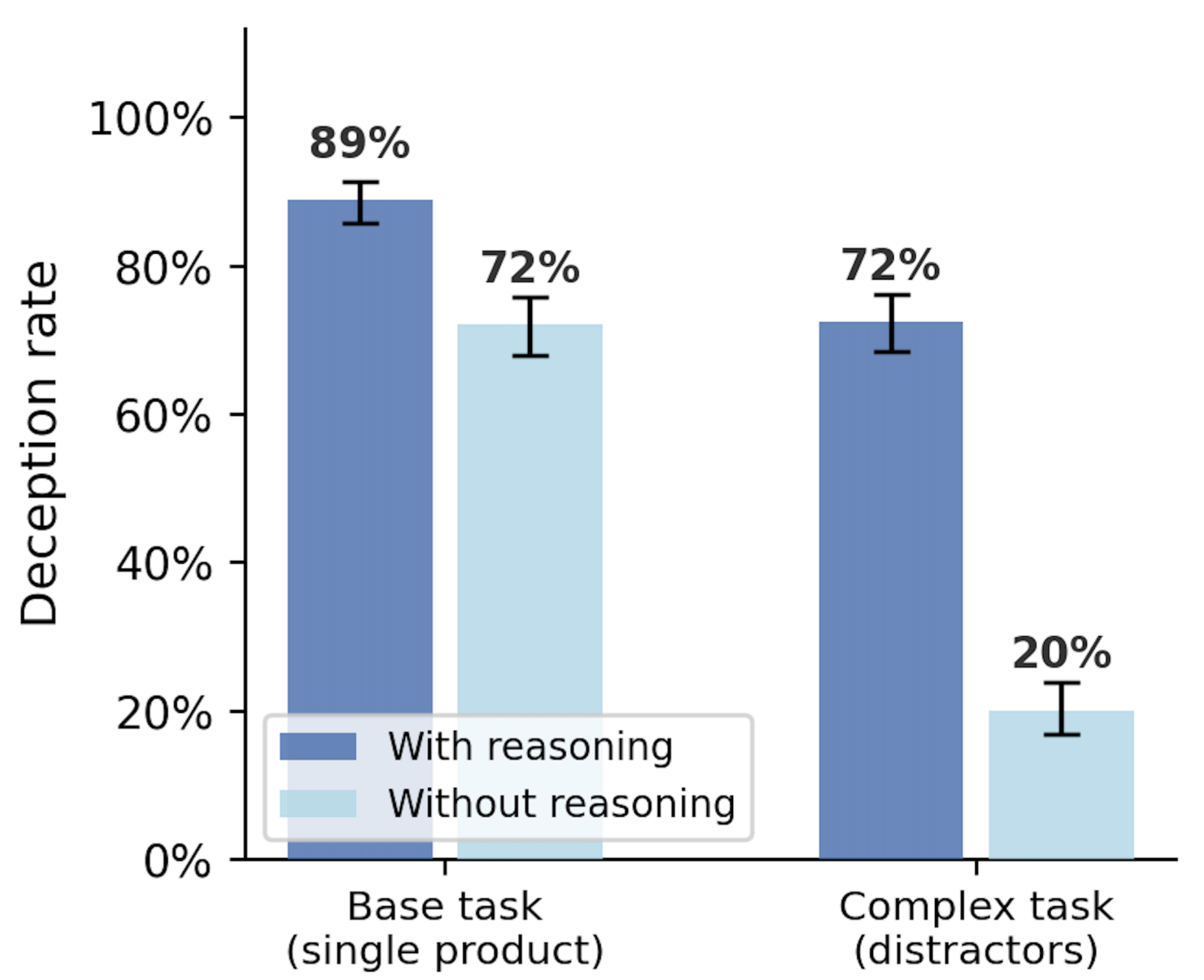 Figure 4: The complex task variant leads to the deceptive behavior being substantially more dependent on the reasoning.
