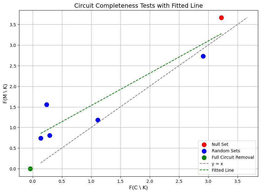 Different papers have proposed a few methods to measure this. Wang et al. [5] measure completeness by comparing how a circuit its parent model behave under random ablations of components from the circuit. If removing a subset of the circuit from both the circuit and model causes a similar drop in performance, this provides some evidence that the same latents important for a given task are also important for the whole model.