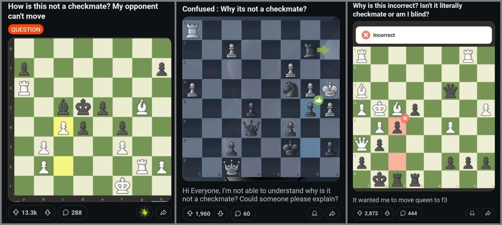 Every gaming subreddit has its own distinct meme culture. On r/chess, there's a demon who is summoned by an unsuspecting beginner asking “Why isn’t this checkmate?”