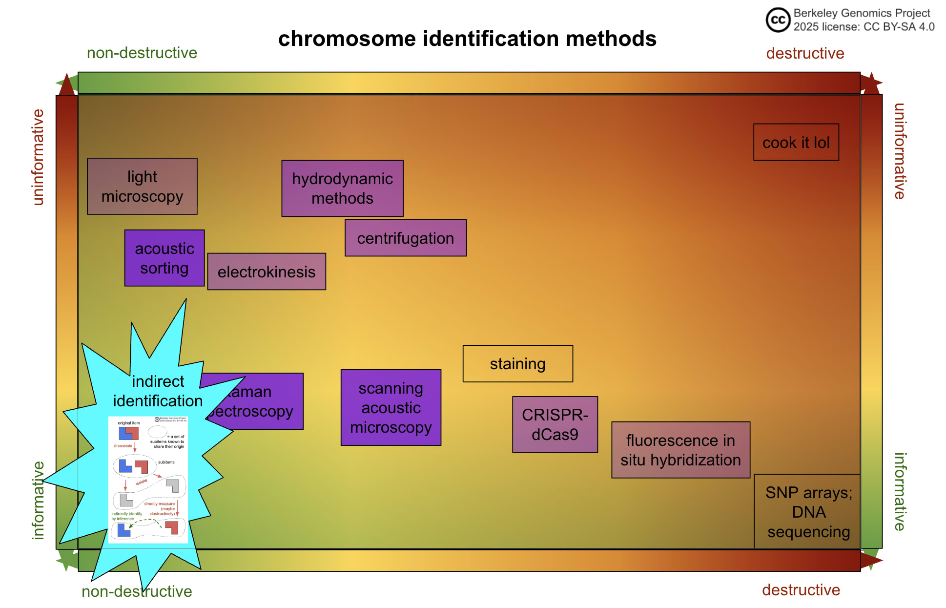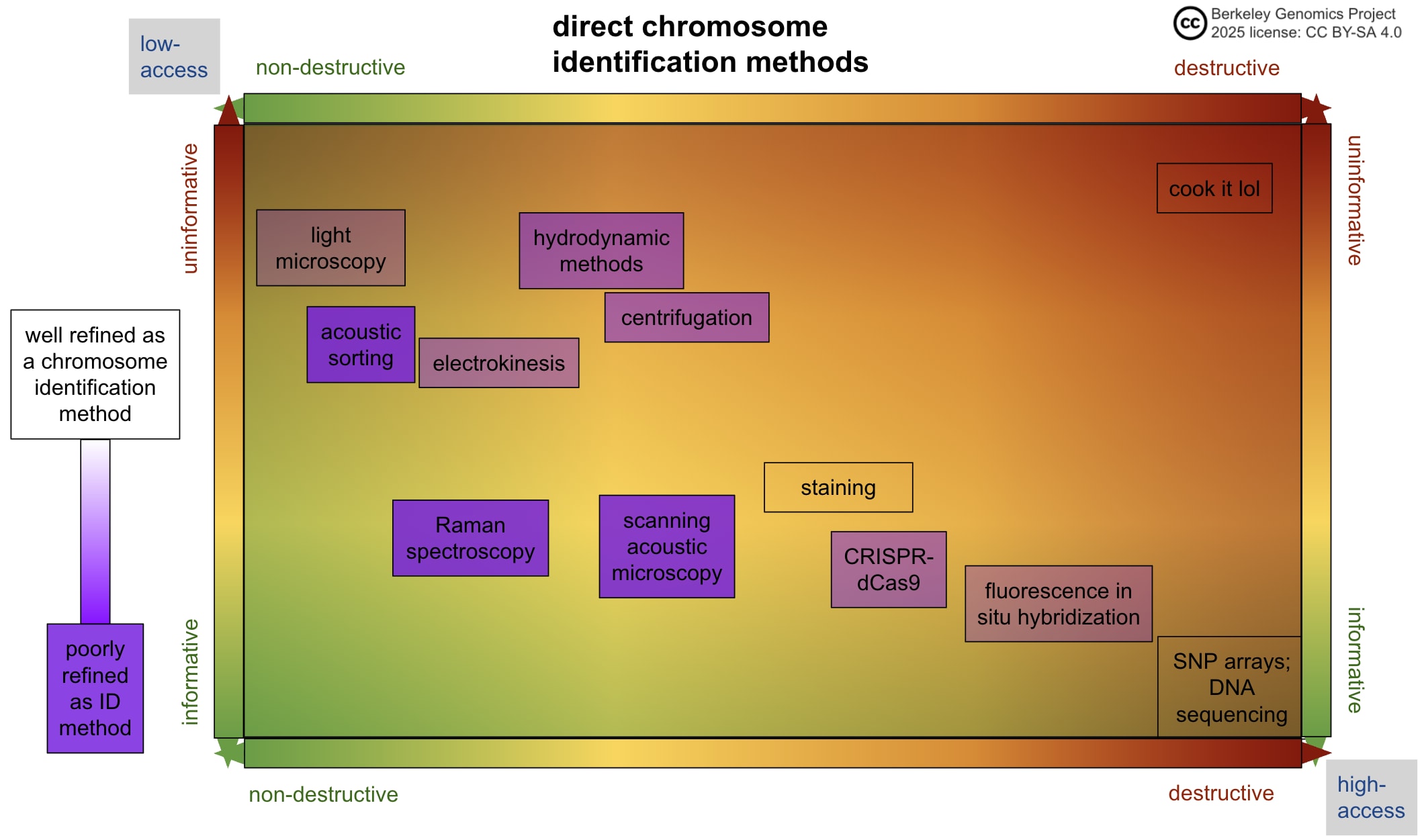 This problem has been approached from many angles. There are several central staples of molecular biology, such as DNA sequencing, karyotyping, flow cytometry, CRISPR-Cas9, and FISH; and there are several speculative attempts to study chromosomes in unusual ways, such as acoustics, laser scattering, hydrodynamic sorting, and electrokinesis.