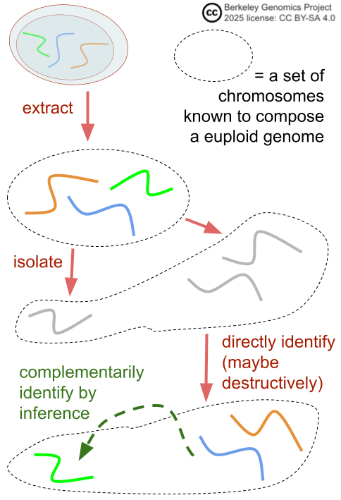 By combining complementary chromosome number identification with one of these indirect allele-measuring methods ("setwise homolog identification"), we could in theory isolate a single fully intact chromosome with a confidently, almost completely known genome.