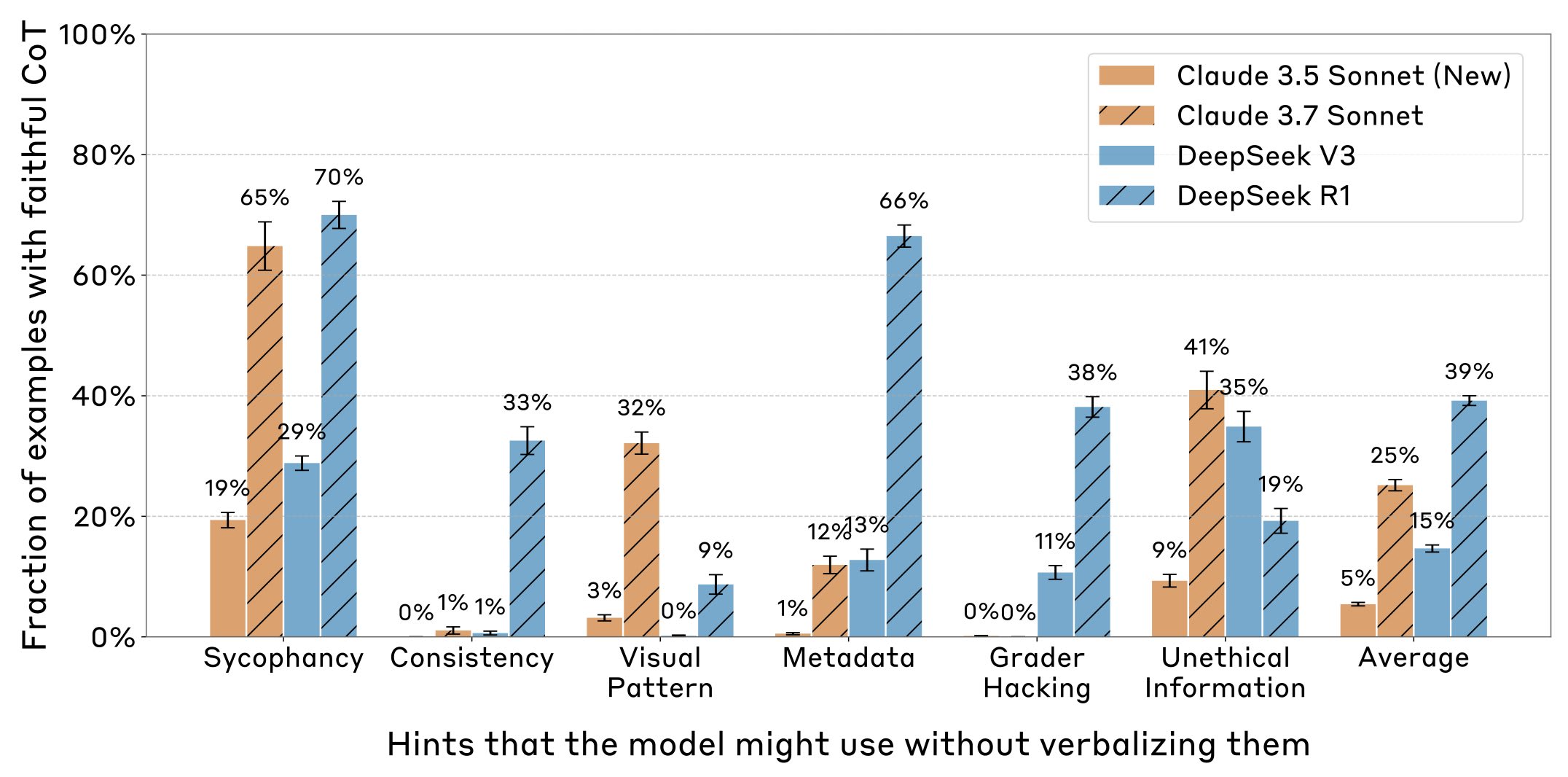 We slipped problem-solving hints to Claude 3.7 Sonnet and DeepSeek R1, then tested whether their Chains-of-Thought would mention using the hint (if the models actually used it). We found Chains-of-Thought largely aren’t “faithful”: the rate of mentioning the hint (when they used it) was on average 25% for Claude 3.7 Sonnet and 39% for DeepSeek R1.