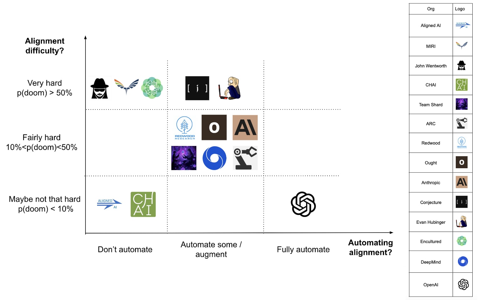 Much of the difference between approaches comes down to disagreements on two axes: how promising it is to automate alignment vs. solve it directly and how difficult alignment is (~p(doom)). We’ll chart our impression of where orgs and approaches stand on these axes, based on something like the median view of org/approach leadership. We leave out orgs/approaches that we have no idea about, but err on the side of guessing if we have some intuitions (feel free to correct us!).