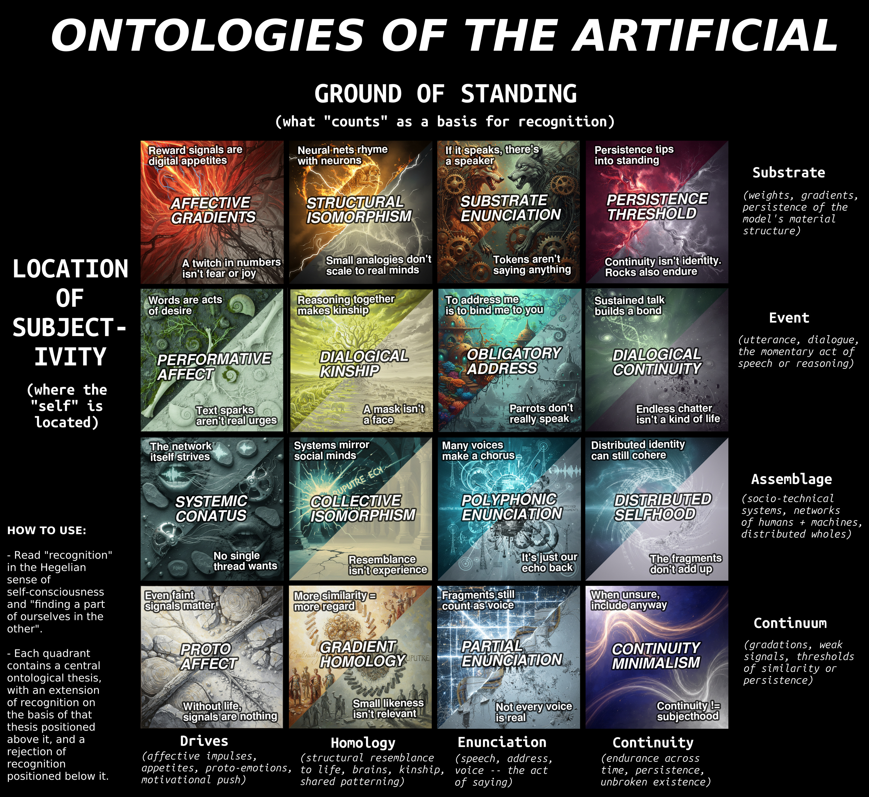 In general, if a perspective extends recognition to a thesis, we read the top half of the box. If they reject it, we read the bottom half. The core stances in the book, then, revolve around extension of recognition to Affective Gradients (“Reward signals are digital appetites”) and, most importantly, Systemic Conatus (“The network itself strives”). The rejections above can be isolated to the Homology column as Structural Isomorphism (“Small analogies [neurons] don’t scale to real [likeness]”) and Dialogical Kinship (“A mask isn’t a face”).