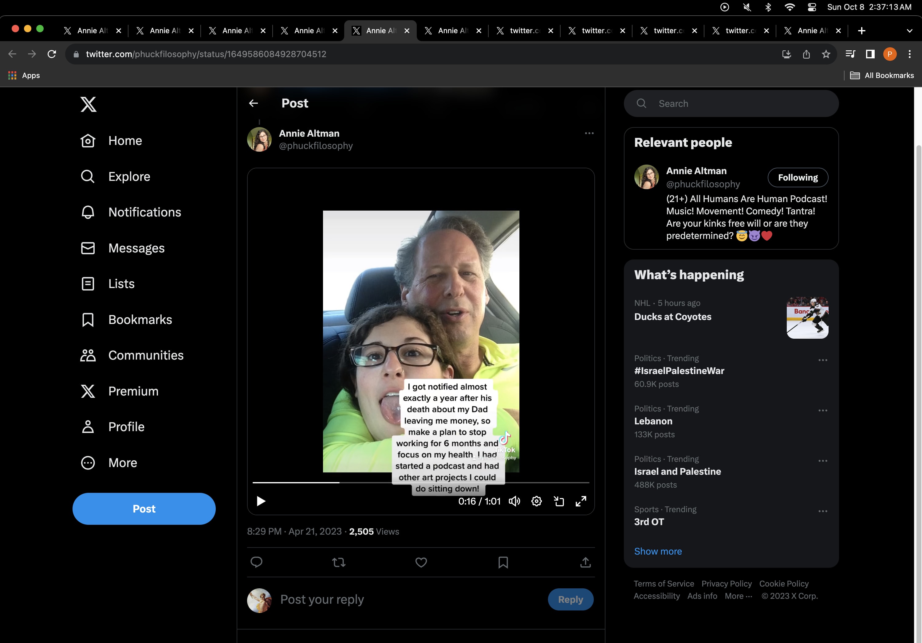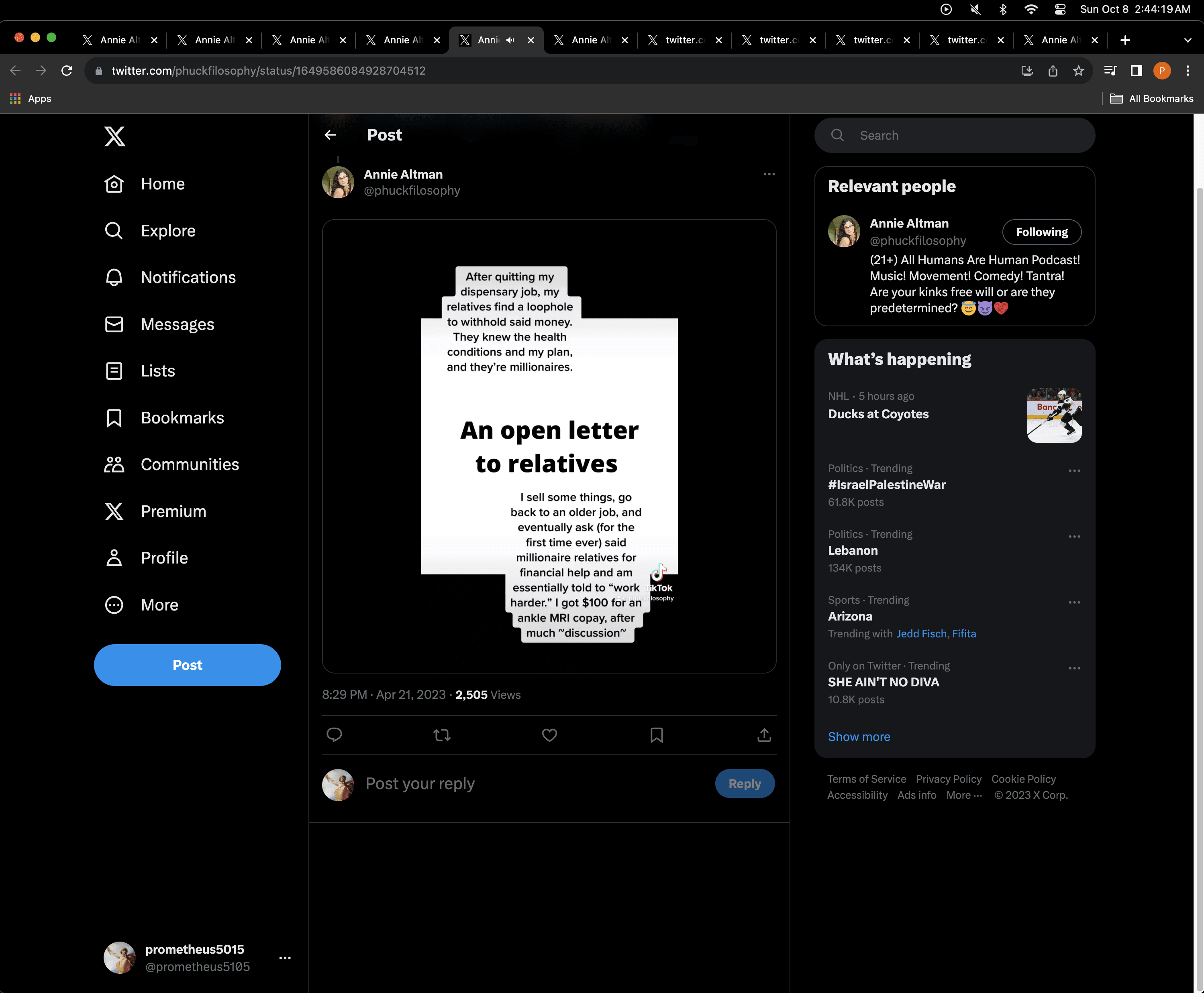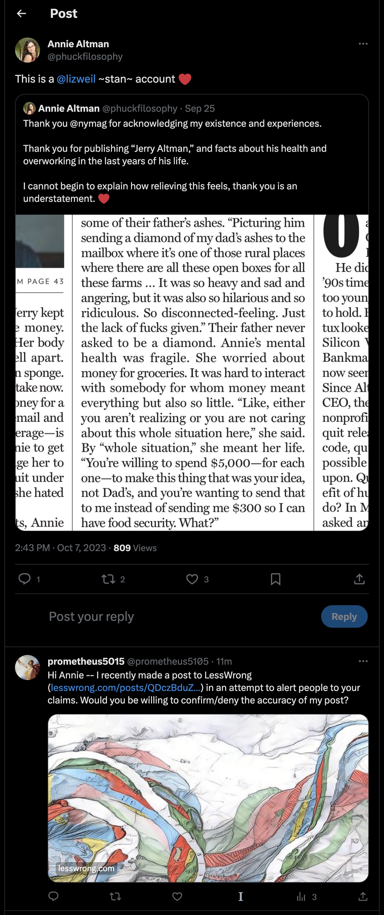 I have made an X account @prometheus5105 where I responded to a recent post of Annie's (on X) asking her to confirm/deny the accuracy of my post: