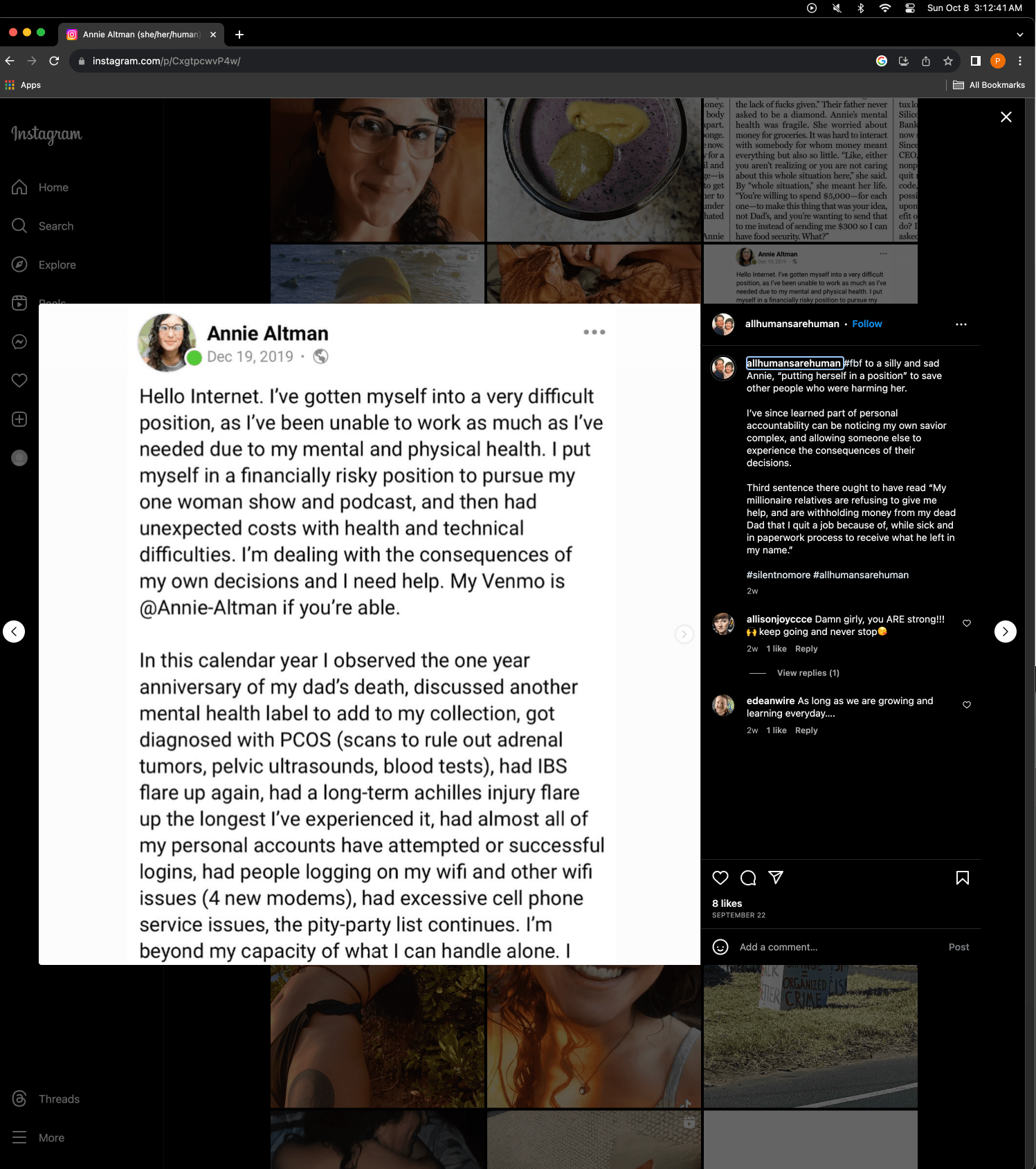 I currently hold that I do not know if Annie's claims are true or not, though I will note that her online activity have been self-consistent over a long period of time, and seems to match up with activity from Sam in a few places (e.g. in the podcast episode she recorded with him.) I currently cannot disprove Sam Altman's innocence, as I do not think I can say that he has been proven guilty.