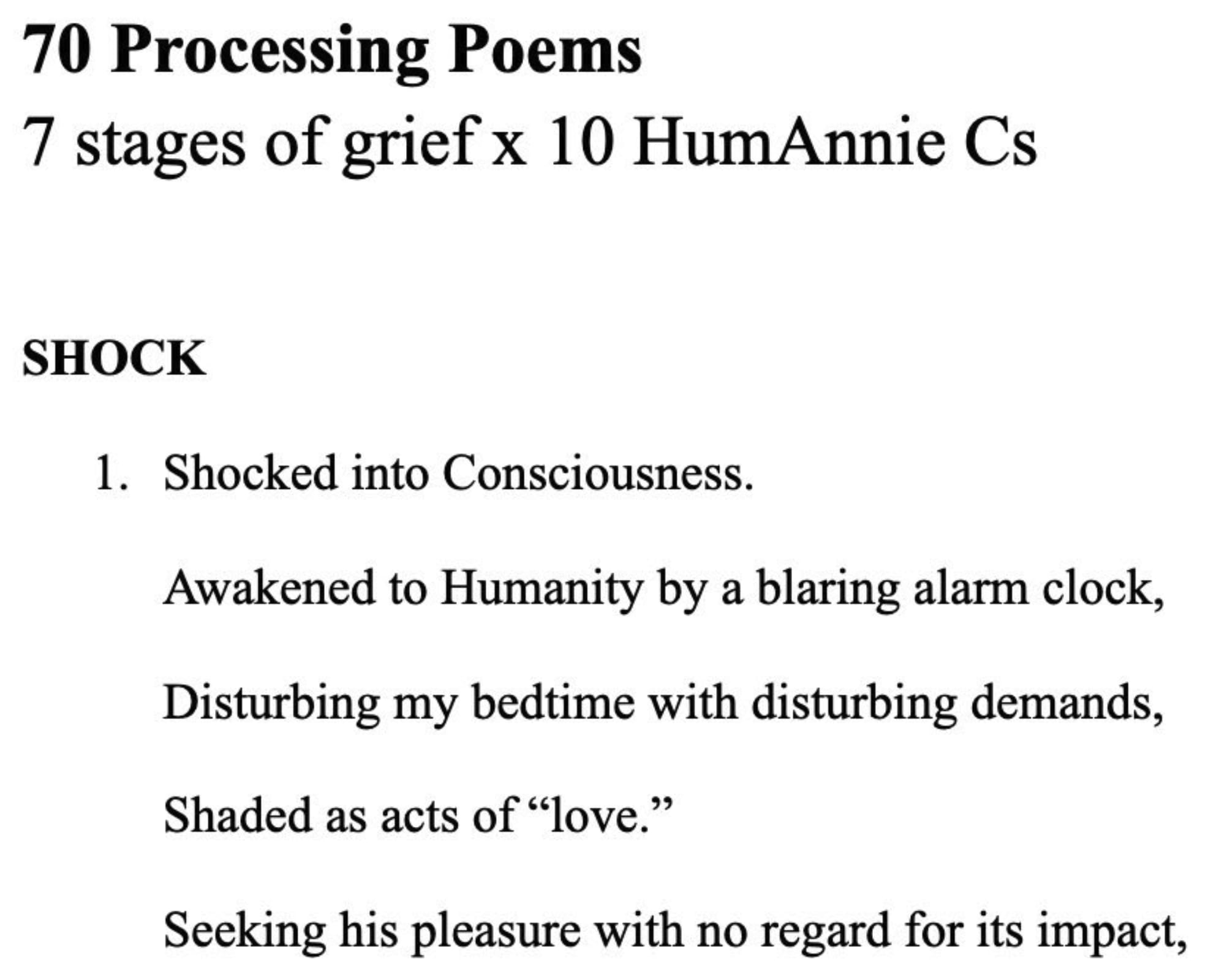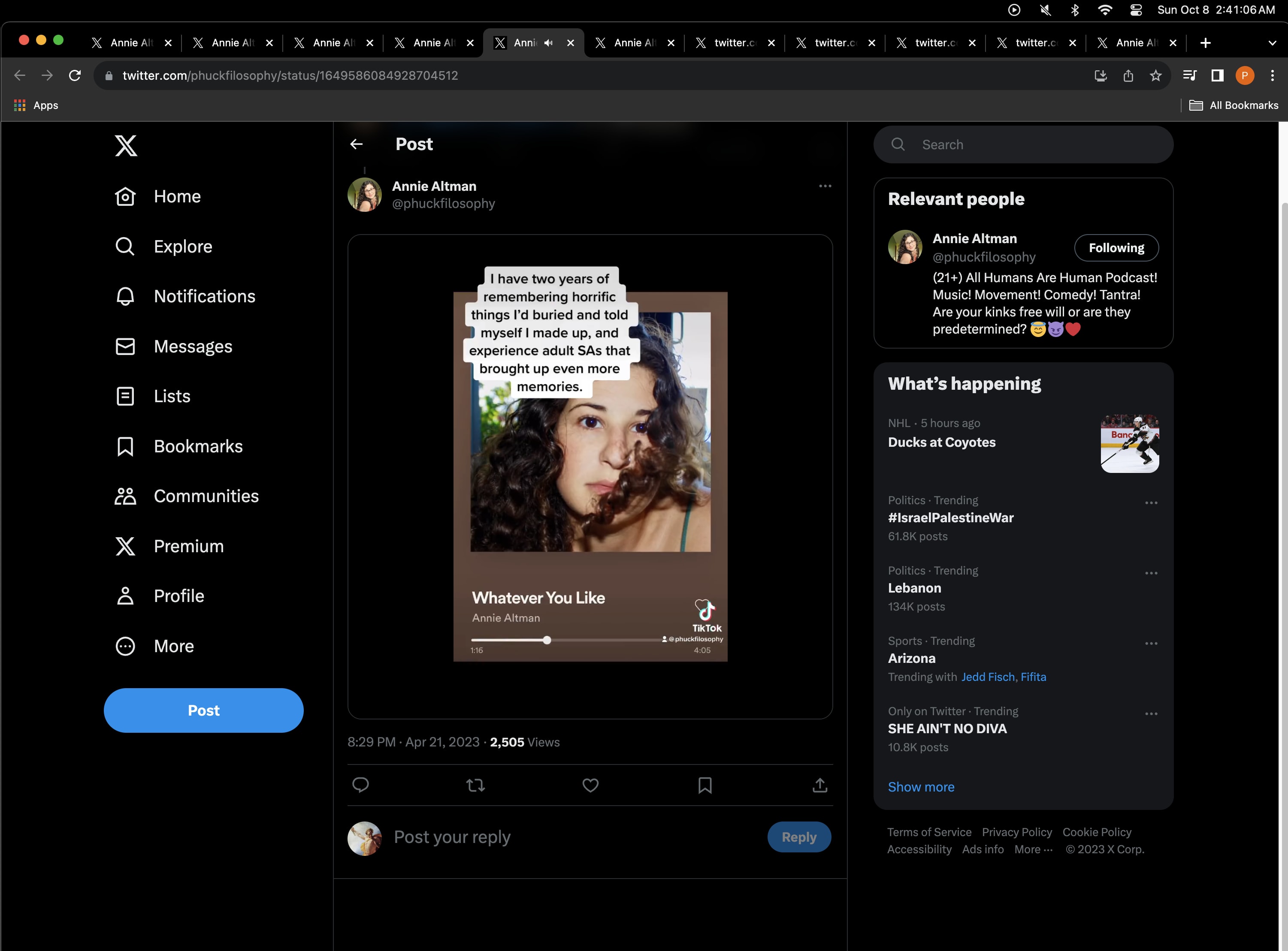Annie states that the forms of abuse she's endured include sexual, physical, emotional, verbal, financial, technological (shadowbanning), pharmacological (forced Zoloft), and psychological abuse.