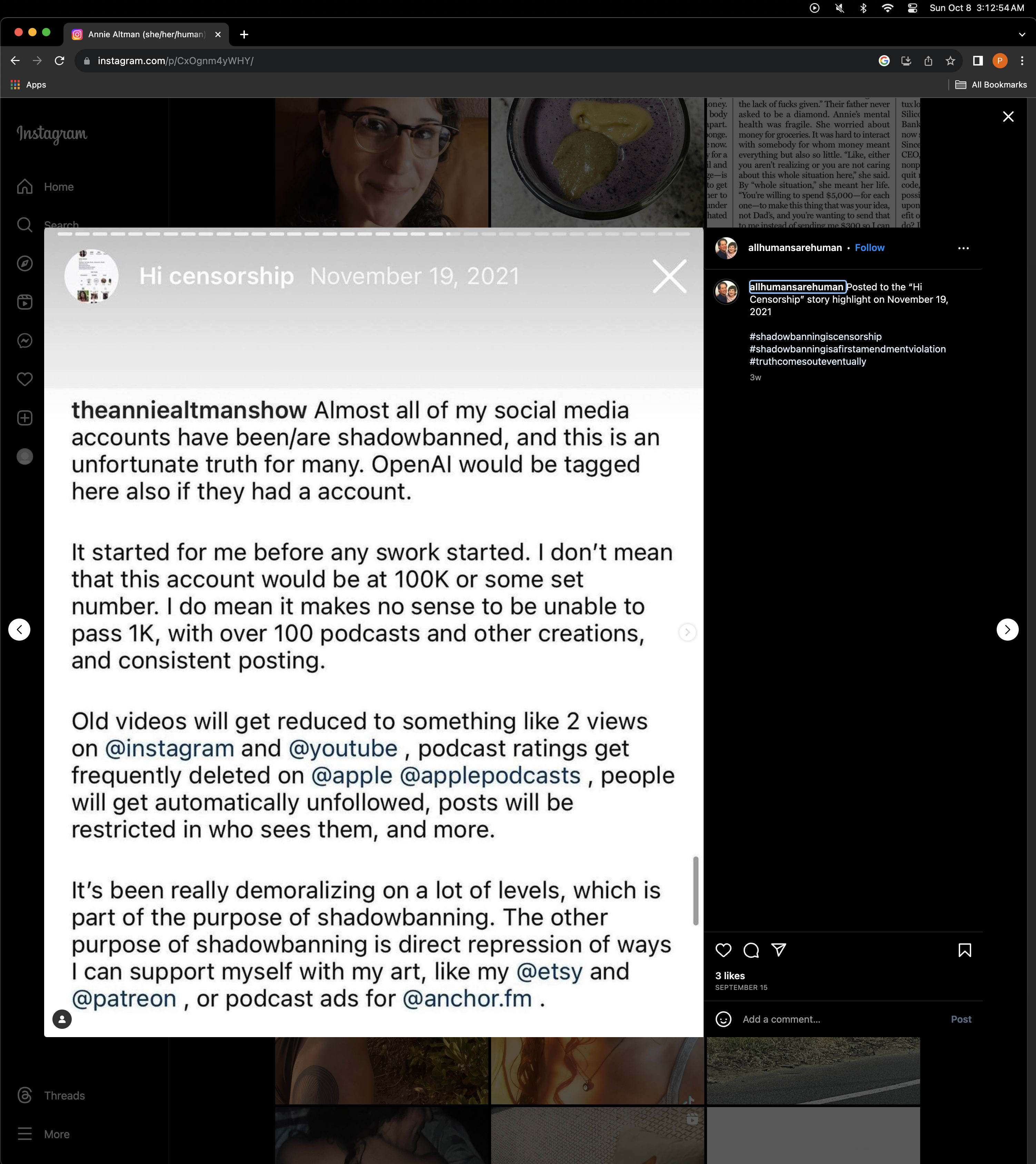 It's been really demoralizing on a lot of levels, which is part of the purpose of shadowbanning. The other purpose of shadowbanning is direct repression of ways I can support myself with my art, like my @etsy and @patreon , or podcast ads for @anchor.fm ."