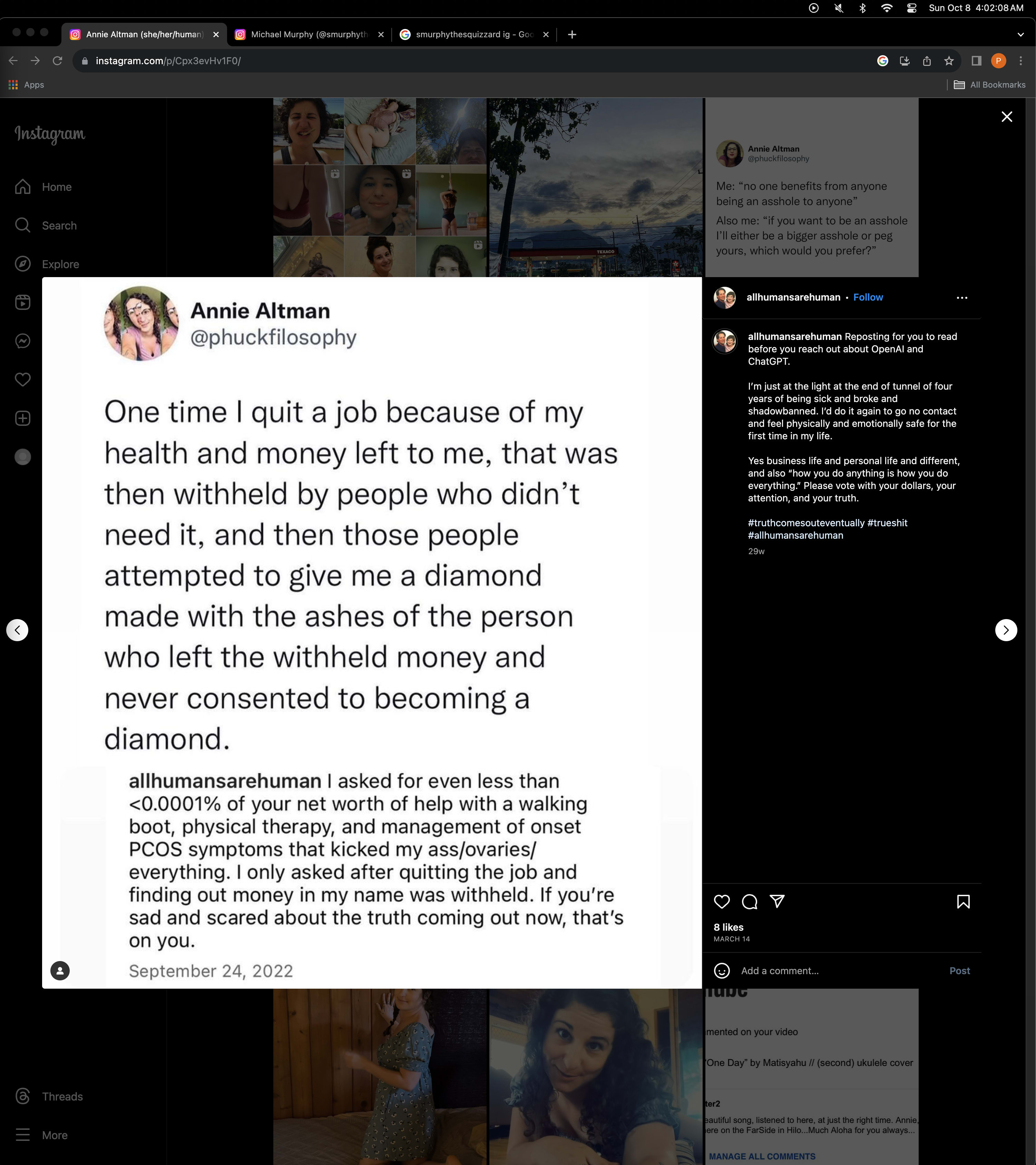 Given the gravity of Sam Altman's position at the helm of the company leading the development of an artificial superintelligence which it does not yet know how to align -- to imbue with morality and ethics -- I feel Annie's claims warrant a far greater level of investigation than they've received thus far.
