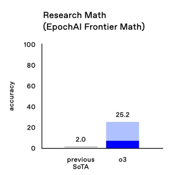 Well, on FrontierMath 2024-11-26, o3 improved the state of the art from 2% to 25% accuracy. These are extremely difficult, well-established, held-out math problems. And on ARC, the semi-private test set and public validation set scores are 87.5% (private) and 91.5% (public). [thread continues]