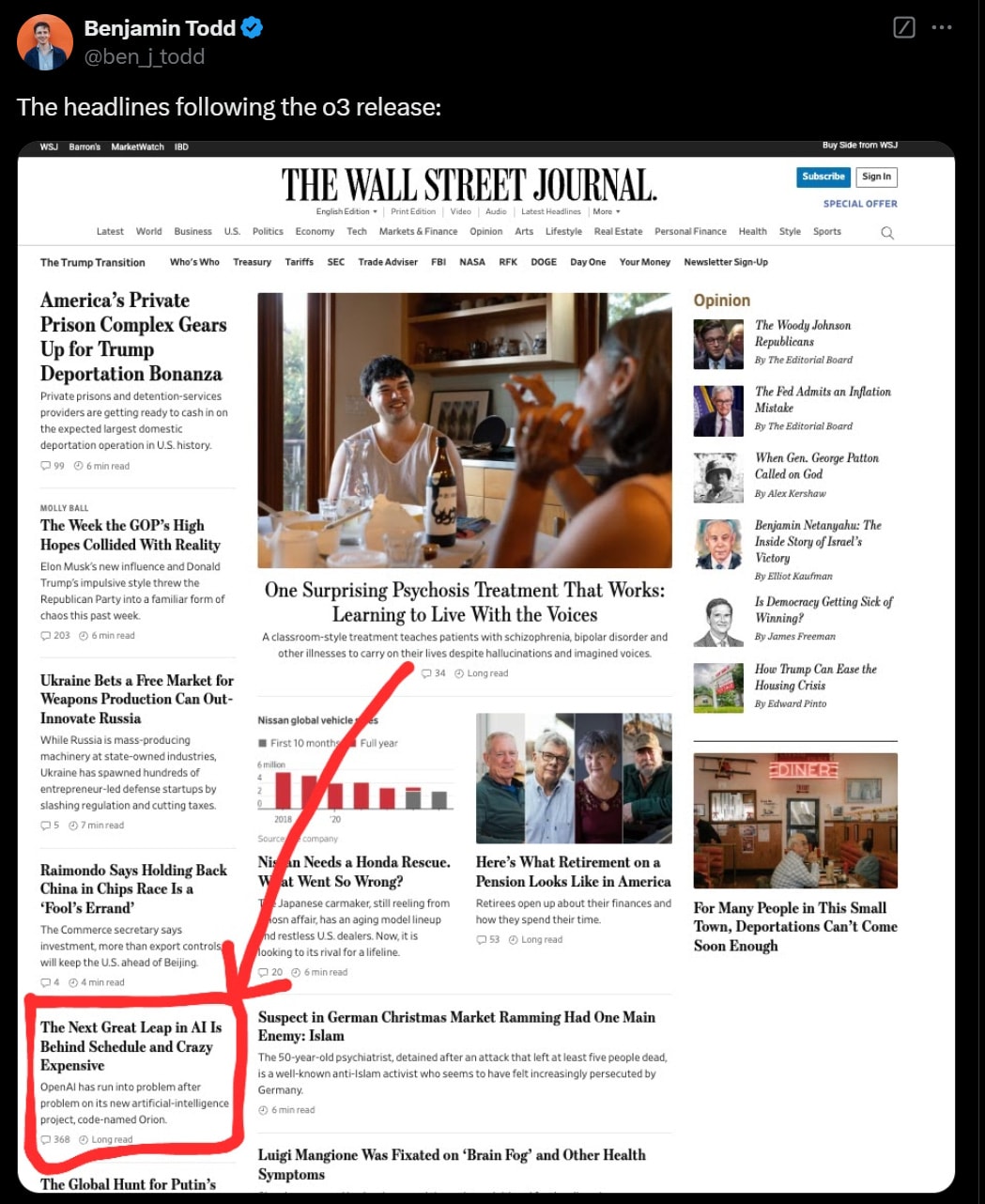 Here is that WSJ story, talking about how GPT-5 or ‘Orion’ has failed to exhibit big intelligence gains despite multiple large training runs. It says ‘so far, the vibes are off,’ and says OpenAI is running into a data wall and trying to fill it with synthetic data. If so, well, they had o1 for that, and now they have o3. The article does mention o1 as the alternative approach, but is throwing shade even there, so expensive it is.