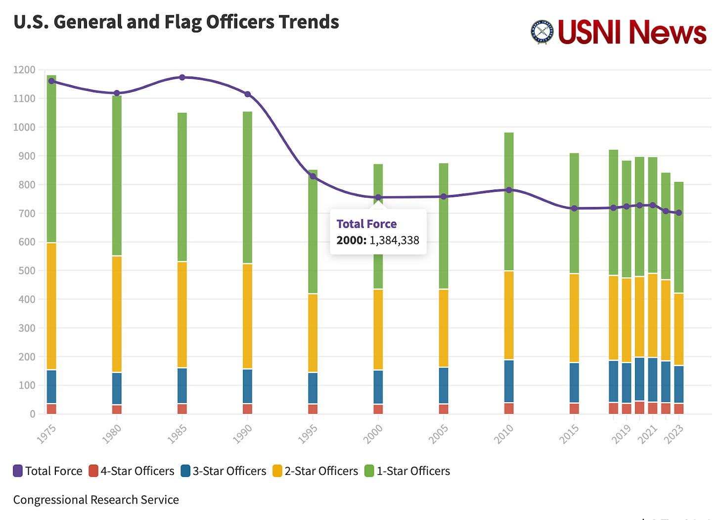 Secretary of Defense Hegseth ordered a reduction in the numbers of higher-ranking officers across the military: 20% of all four-star officers, 10% of all general and flag officers across the active-duty military, and 20% of all general officers in the National Guard. These cuts would eliminate about 180 officers. There are currently 38 four-star officers in the military; the military has had approximately 40 four-star officers since 1965. The number of general and flag officers in the military is set by Congress in Title 10 of the U.S. Code.