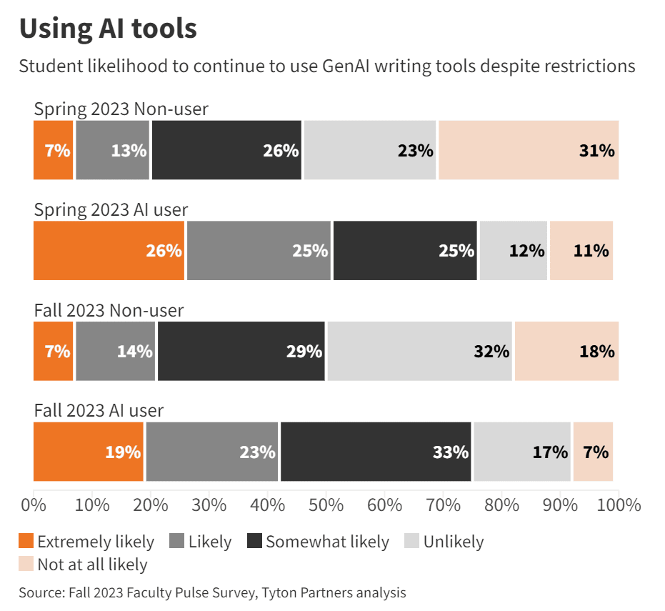 College students adopting new AI technologies faster than professors, surprising no one. How much you use them and how much you get out of them matters, so the gap is bigger than the pure usage statistics. And students mostly have no intention of stopping, even if use is technically banned: