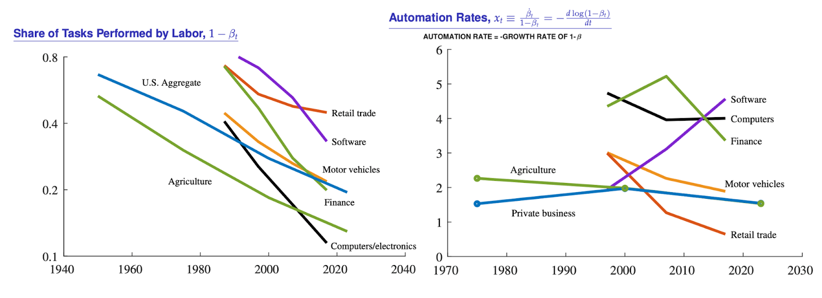 This assumption is extremely aggressive in the sense that it is focused on capabilities and ignores diffusion. It is possible that AI could theoretically automate a large fraction of tasks but for many reasons it would not automate them in practice. (Though it is also possible that diffusion will progress unevenly, with sudden unlocking of latent capabilities.) It is also important to note that this intuition runs counter to broad trends in automation over the last 80 years which have historically been linear - with the share of automated tasks growing slowly and steadily, with a single-digit percent rate of automation that is often declining over time. See the following charts from C. Jones and Tonetti (2025), via ChatGPT: