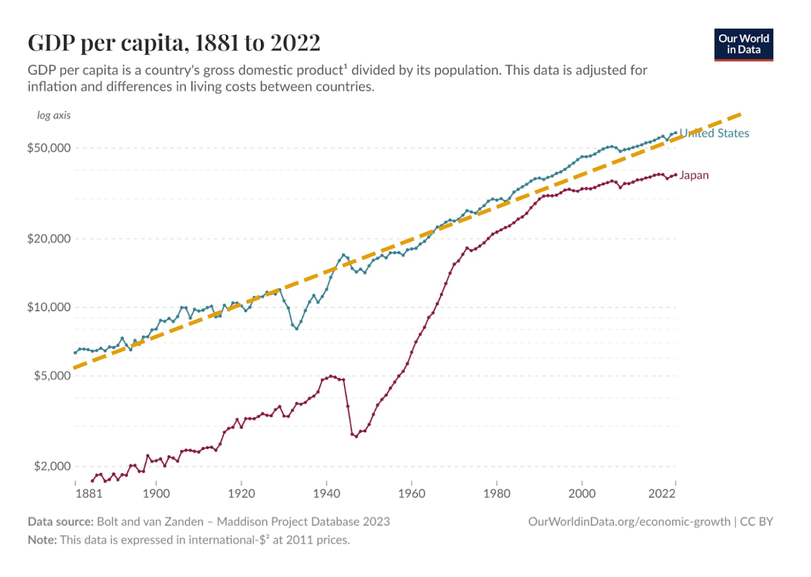 Note that there are critiques of GDP as a measure of progress, and various alternative measures have been proposed. However, many of these are also at least loosely correlated with GDP, with a spike in one corresponding to a spike in the other. E.g., see this chart of the augmented human development index of the U.S. and Japan.