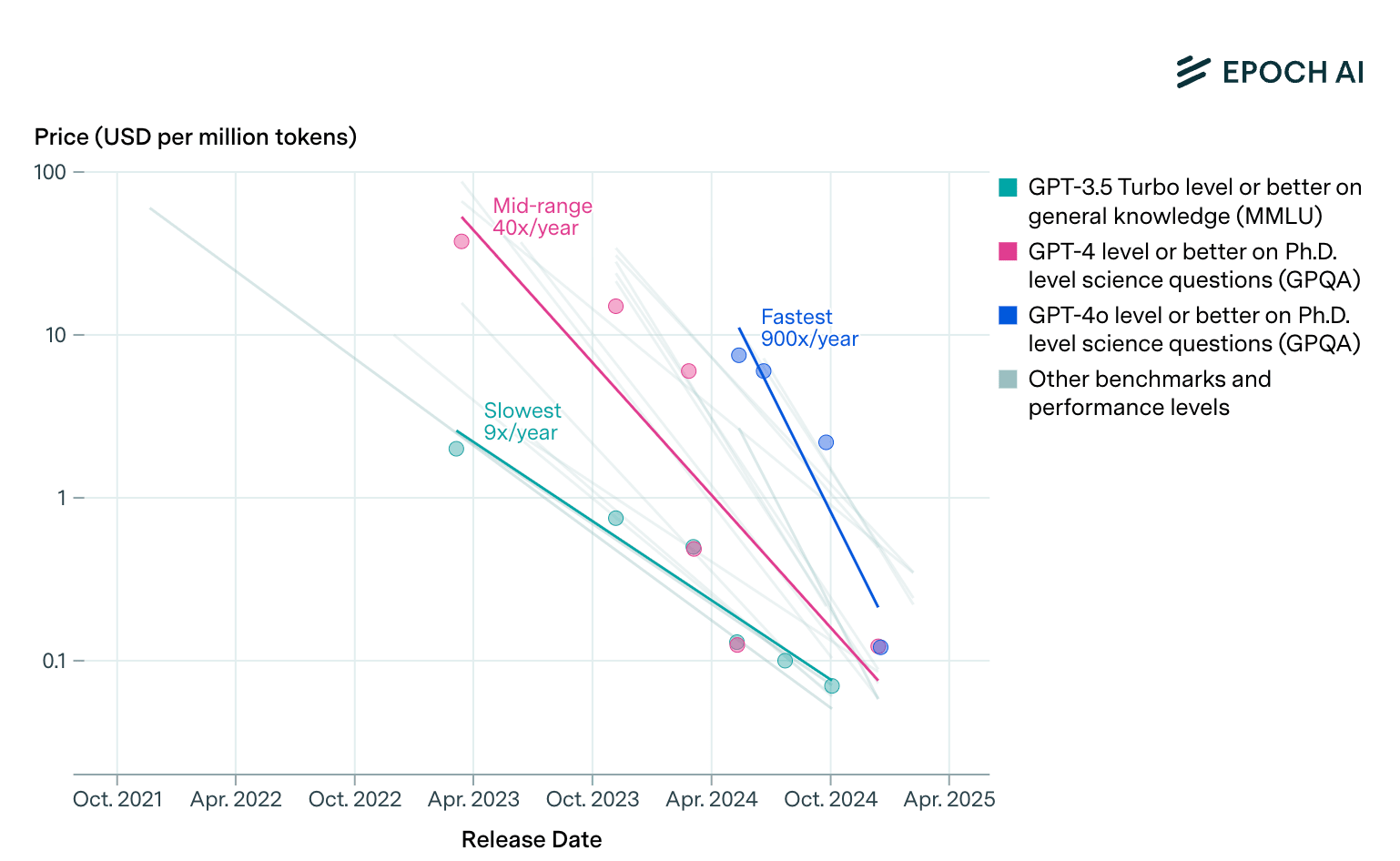 Another striking statistic has been the rapid reduction in prices for inference. That is, while it is often costly to extend the frontier of intelligence, once we achieve a certain level X, the cost to provide the same level has been decaying by factor 10x or more per year. It seems that once we reach a certain frontier the first time, it is much cheaper and easier to reach it for the second time (see also the “deepseek moment”). If this trend continues, it might mean that once a job is automated, within a year the cost for AI to do it will become insignificant.