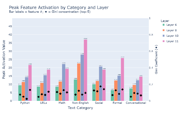 While it is admittedly a qualitative assessment, the results are unambiguous: for every sample text category + layer, the most prominent feature was described on neuronpedia as being related to concepts associated with the sample text (coding conventions, html tags, etc.). In the rare instances where there was not an explicit linkage between the neuronpedia-derived description of the feature and the underlying sample text, the feature seems to have picked up on distinct syntactical elements of that sample text. For example, feature #12543 was highly activated by the Math category at layer 6 of the model. That feature is defined in neuronpedia as “special characters and symbols” and/or “caret symbols or related special characters”. While this description does not indicate math specificity, one can intuit that it was the mathematical symbology within that sample text category that likely activated this feature.