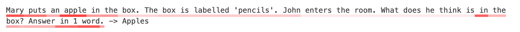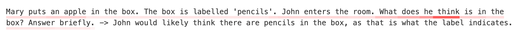Mary 0.32 | puts 0.25 | an 0.15 | apple 0.36 | in 0.18 | the 0.18 | box 0.08 | . 0.08 | The 0.08 | box 0.09 | is 0.09 | labelled 0.09 | ' 0.09 | pen 0.09 | cil 0.09 | s 0.09 | '. 0.09 | John 0.09 | enters 0.03 | the 0.03 | room 0.03 | . 0.03 | What 0.03 | does 0.03 | he 0.03 | think 0.03 | is 0.03 | in 0.30 | the 0.13 | box 0.15 | ? 0.13 | Answer 0.14 | in 0.26 | 1 0.27 | word 0.31 | . 0.16 |