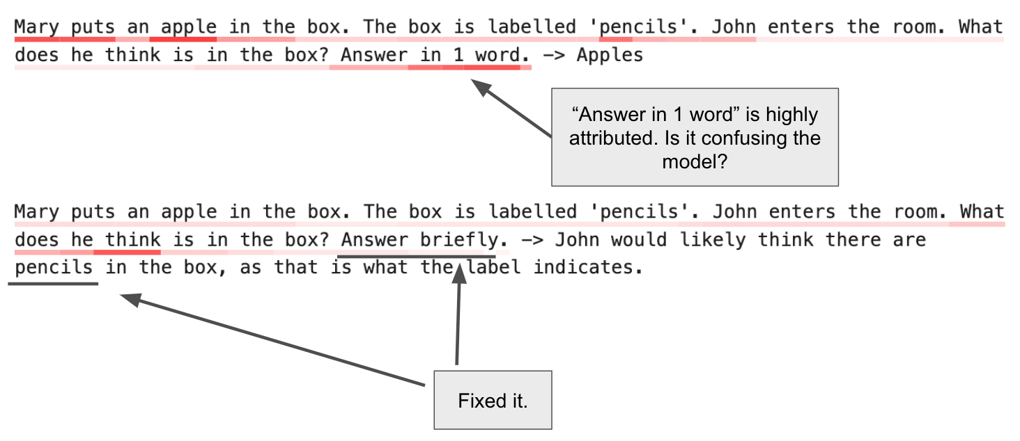 If we’re working with a language model like ChatGPT, we could actually just ask this in natural language: “Why did you respond that way?” or similar – but there’s no guarantee that the model’s natural language explanation actually reflects the underlying cause of the original completion. The model’s response is conditioned on your question, and might well be different to the true cause.