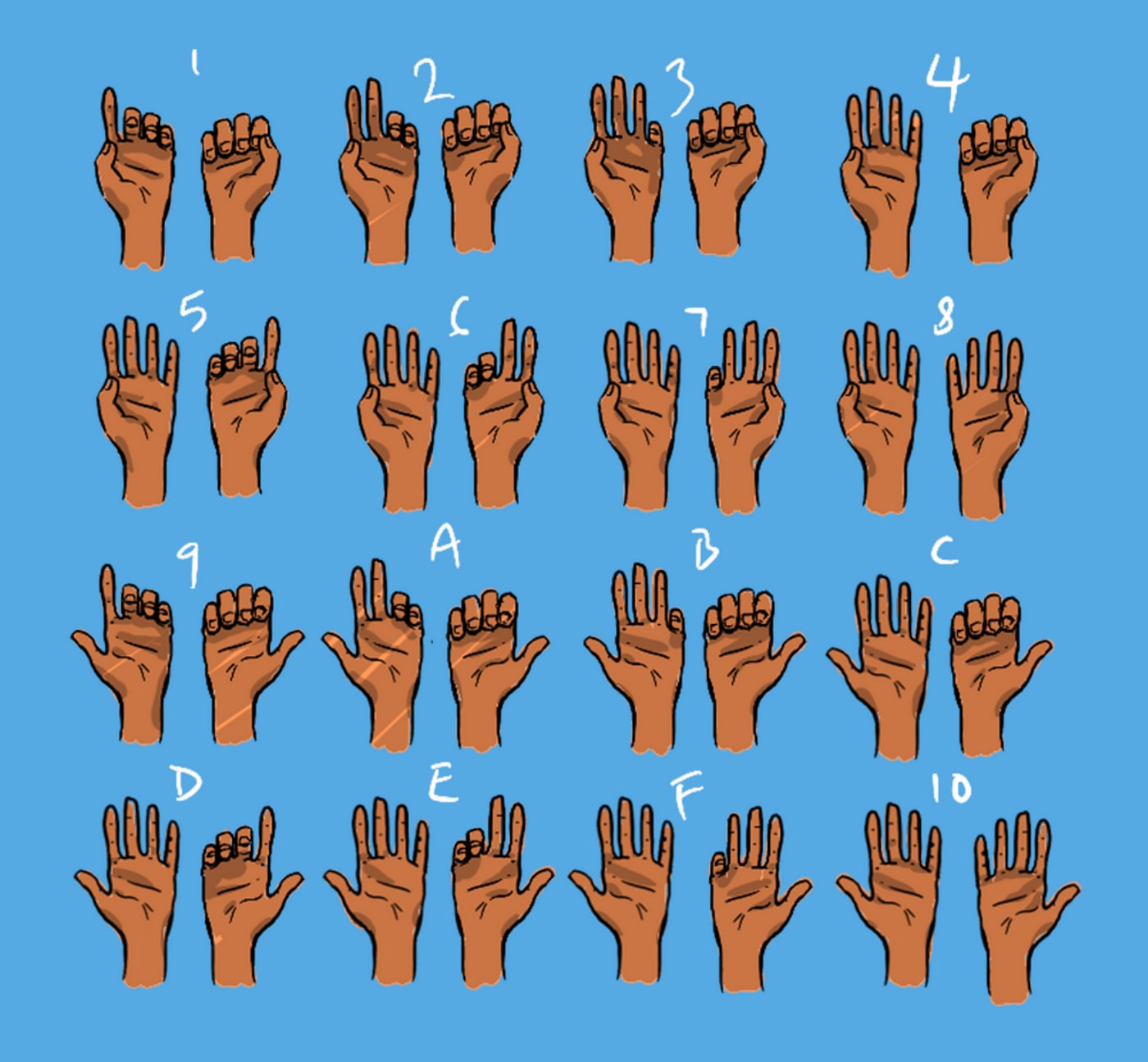 Also, the intuitiveness of the decimal system, when it comes to finger-counting, shouldn’t be discounted. A low barrier to entry for students learning maths might be more important than a more useful counting system. However, lying wide awake one night, I conceived of away to finger-count to 16 using your thumbs as a switch.