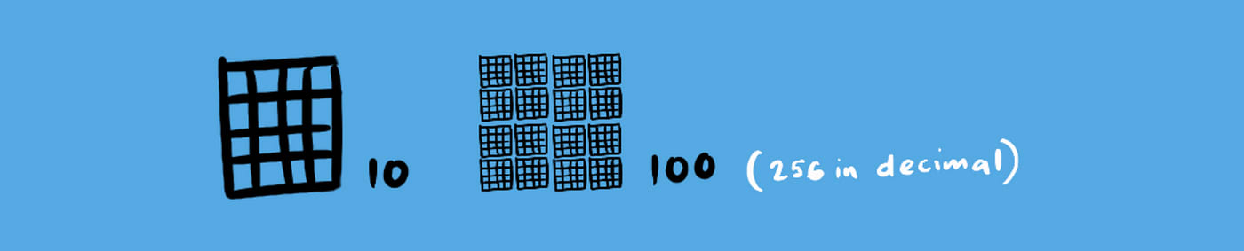 Finally, my pick is Hexadecimal (base 16), which has risen to prominence in the era of computers because it aligns perfectly with binary values. 10 in hexadecimal is equivalent to 10000 in binary (16 in decimal), and 100 in hexadecimal is equivalent to 100000000 in binary (or 256 in decimal). Hexadecimal values are used in web colors, where each channel has 256 potential values (0–255 or in hexadecimal 0-FF). The value for white in hexadecimal is FFFFFF, which is equivalent to 111111111111111111111111 in binary.
