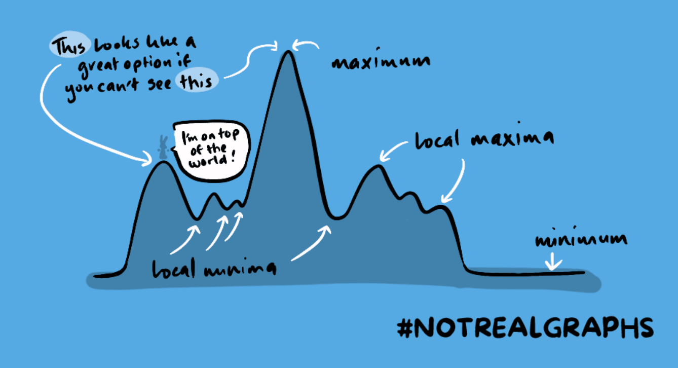 The QWERTY keyboard layout is an example of a local maximum, which exists due to the inertia of history. A local maximum is where an option is much better than its neighboring options, but is not the optimal choice.