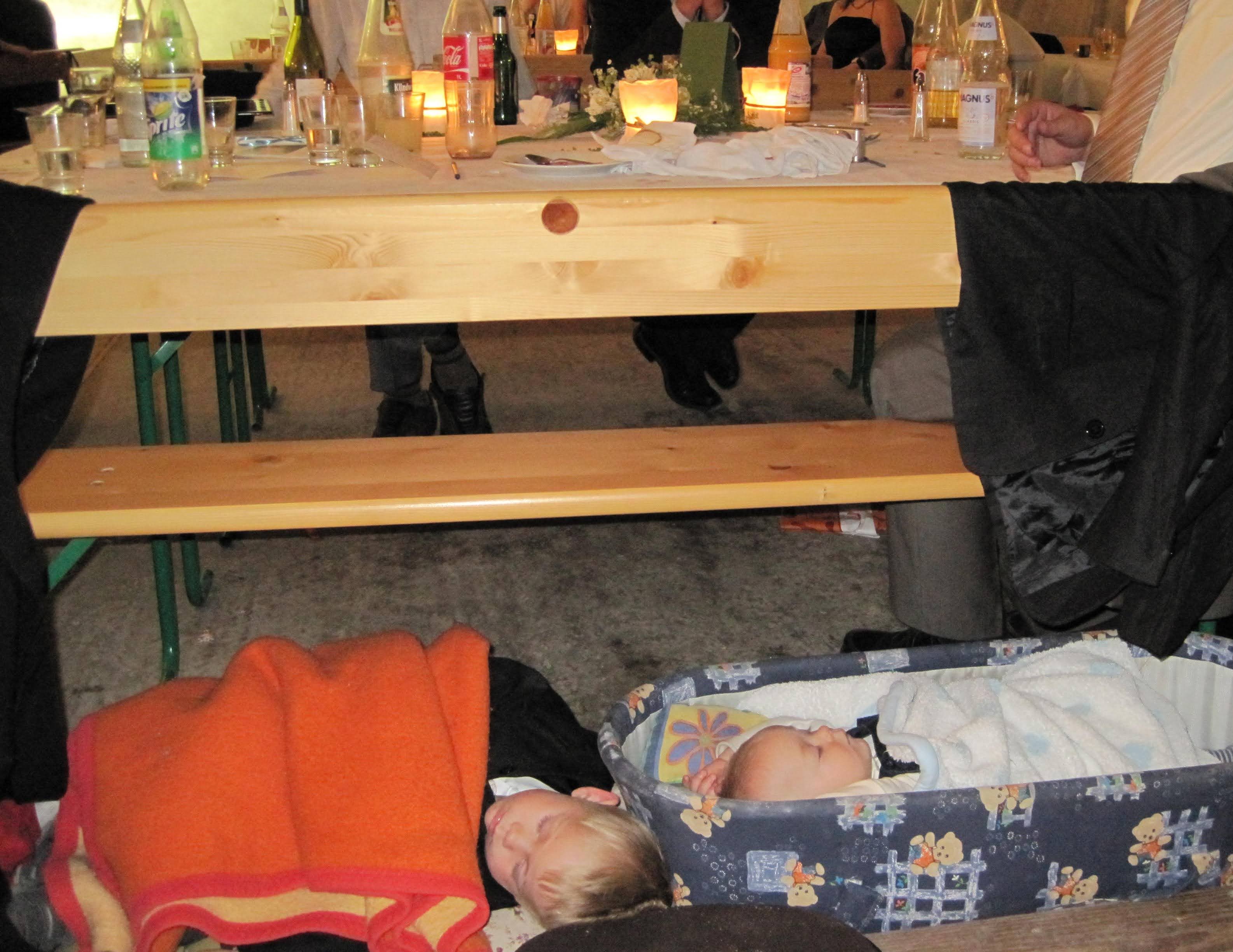 I found a photo of two of my kids sleeping "on stage." This table was right next to the stage at my sisters wedding and the music was not quiet for sure.